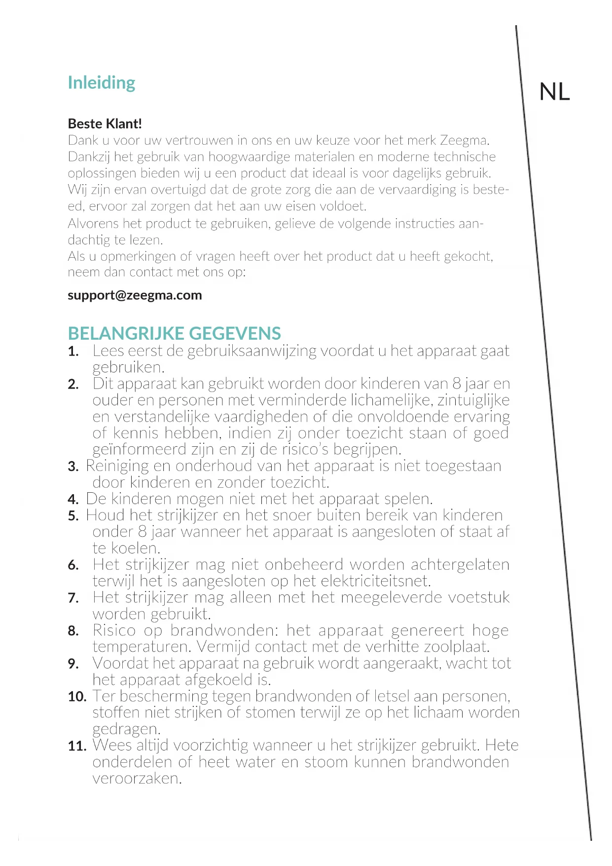 - Cuando se planchan telas sintécas a una temperatura demasiado alta, existe el riesgo de dañar la tela, así como de cubrir la suela con restos de tela sintéca. Para eliminar los restos de tela sintéca, encienda el disposivo y luego planche un trozo de tela de algodón. Las fotos son para nes ilustravos, la apariencia real de los productos puede diferir de la presentada en las fotos.NL Inleiding Beste Klant! Dank u voor uw vertrouwen in ons en uw keuze voor het merk Zeegma. Dankzij het gebruik van hoogwaardige materialen en moderne technische oplossingen bieden wij u een product dat ideaal is voor dagelijks gebruik. Wij zijn ervan overtuigd dat de grote zorg die aan de vervaardiging is beste- ed, ervoor zal zorgen dat het aan uw eisen voldoet. Alvorens het product te gebruiken, gelieve de volgende instruces aan- dachg te lezen. Als u opmerkingen of vragen hee over het product dat u hee gekocht, neem dan contact met ons op: support@zeegma.com BELANGRIJKE GEGEVENS