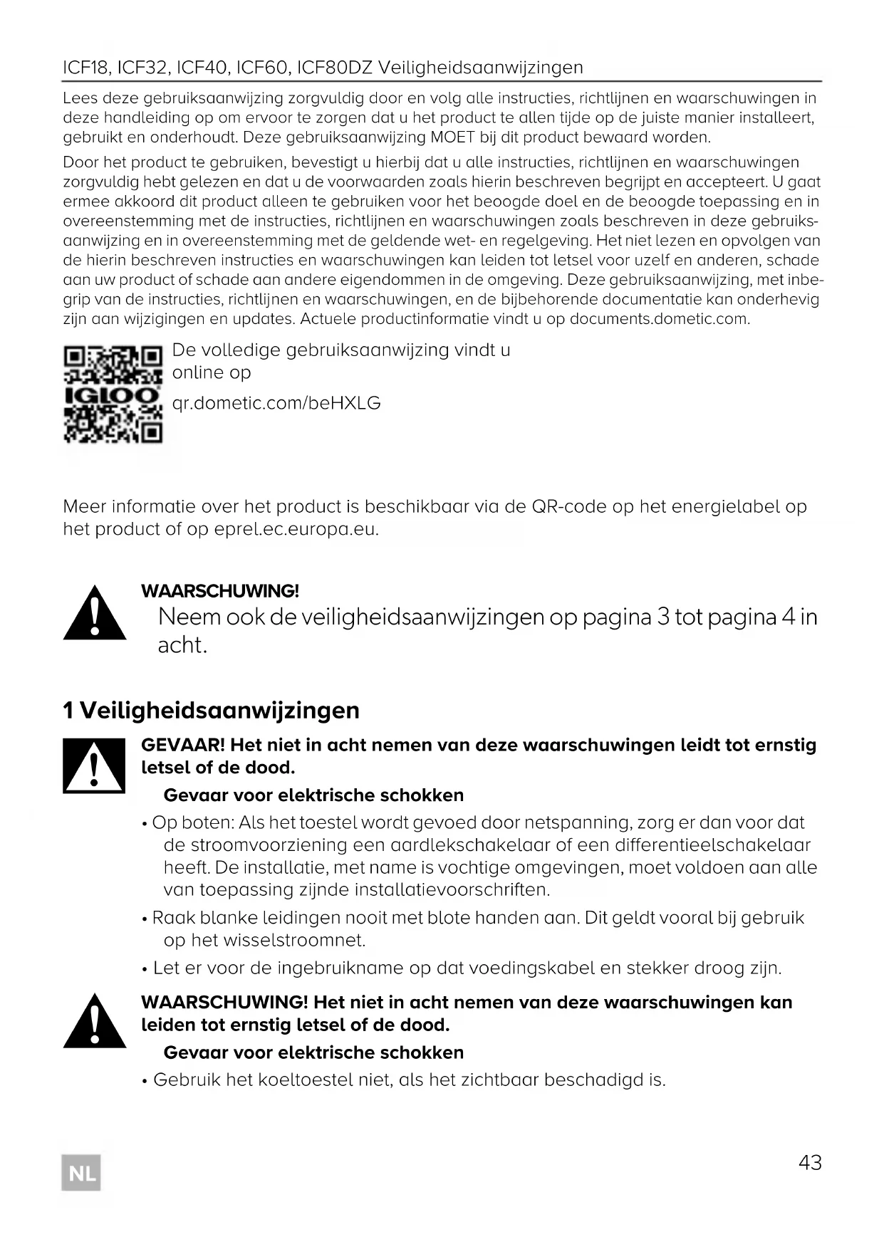 - Gebruik het koeltoestel niet, als het zichtbaar beschadigd is. De volledige gebruiksaanwijzing vindt u online op qr.dometic.com/beHXLG Igloo ICF18, ICF32, ICF40, ICF60, ICF80DZ_ SOM_4445103836_ EMEA24-ar _202x-xx-xx.book Page 43 Friday, September 15, 2023 12:50 PMVeiligheidsaanwijzingen ICF18, ICF32, ICF40, ICF60, ICF80DZ
