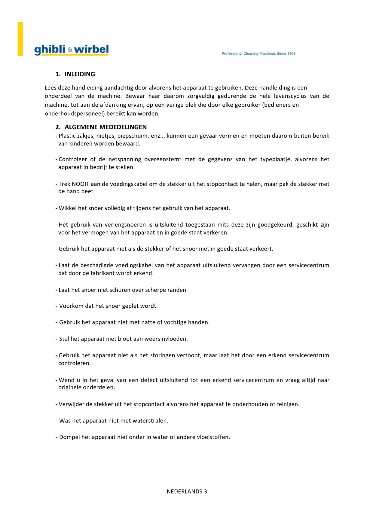 INLEIDING! Het!is!belangrijk!dat!de!stofzuiger!bediend!wordt!door!verantw oord elijk!personeel!dat!het!op!correcte !wijze! laat!werk e n ,!on d e rh o u dt !en !r ep a re er t.!N e e m !c o n ta ct !op !met!de!ve rko p e r!w a n n e er!z ich !p ro b le men! voordoen!tijdens!de!werking.!De!koper!mag!de!stofzuiger!niet!wijzigen!of!onklaar!maken.!In!dit!geval!vervalt! de!garantie!en!is!de!fabrikant!niet!langer!aansprakelijk!voor!eventuele!materiële!schade!of!persoonlijk! letsel.!
