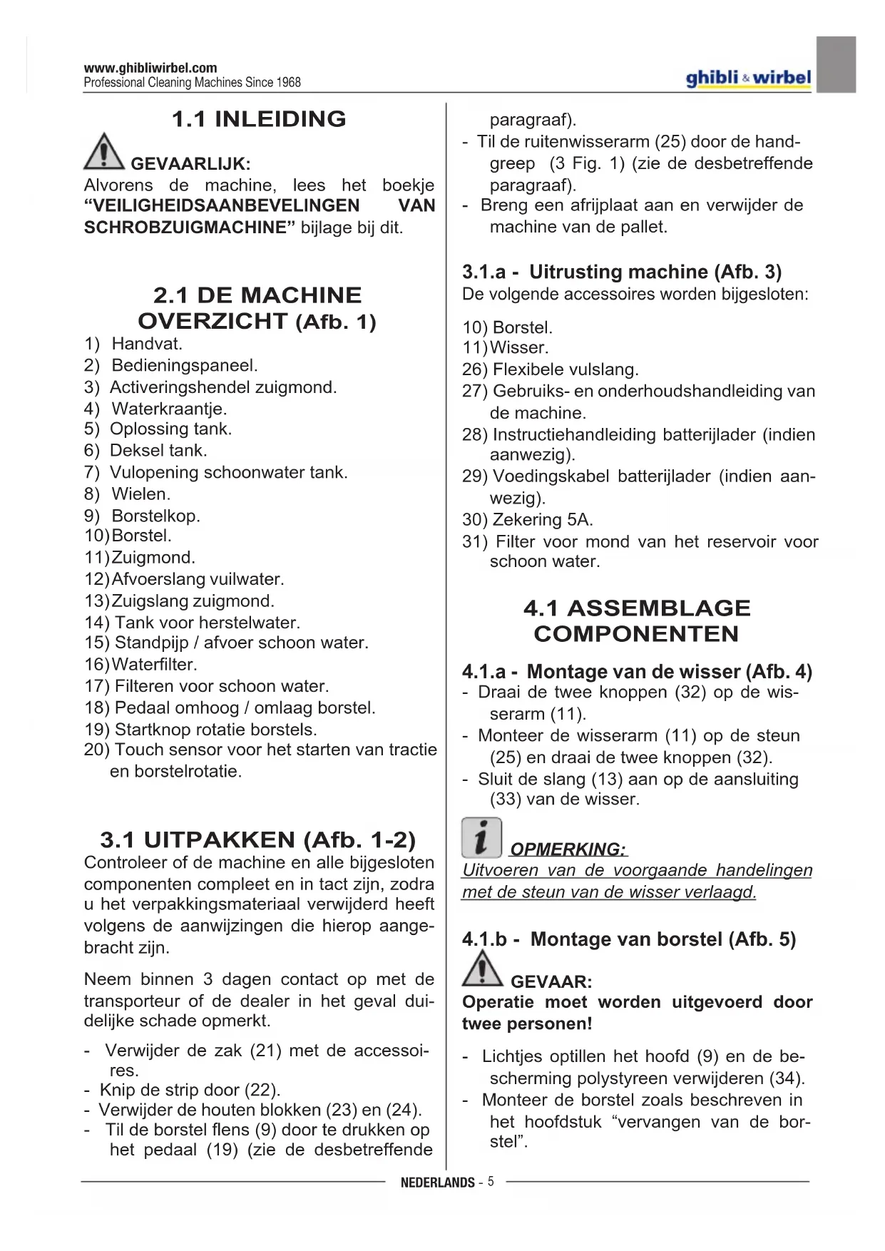 GEVAAR: Operatie moet worden uitgevoerd door twee personen! - Lichtjes optillen het hoofd (9) en de be- scherming polystyreen verwijderen (34). - Monteer de borstel zoals beschreven in het hoofdstuk “vervangen van de bor- stel”. Man_FR30SM45TOUCH_49026500_1ed_02-2018_10L.indd 5 02/03/18 08:45www.ghibliwirbel.com Professional Cleaning Machines Since 1968 NEDERLANDS -