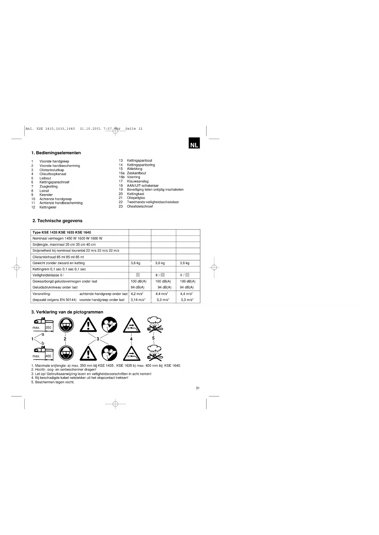 Type KSE 1435 KSE 1635 KSE 1640 Nominaal vermogen 1450 W 1600 W 1600 W Snijlengte, maximaal 35 cm 35 cm 40 cm Snijsnelheid bij nominaal tourental 22 m/s 22 m/s 22 m/s Olietankinhoud 85 ml 85 ml 85 ml Gewicht zonder zwaard en ketting 3,6 kg3,17 kg 3,6 kg 3,6 kg Kettingrem 0,1 sec 0,1 sec 0,1 sec Veiligheidsklasse II /