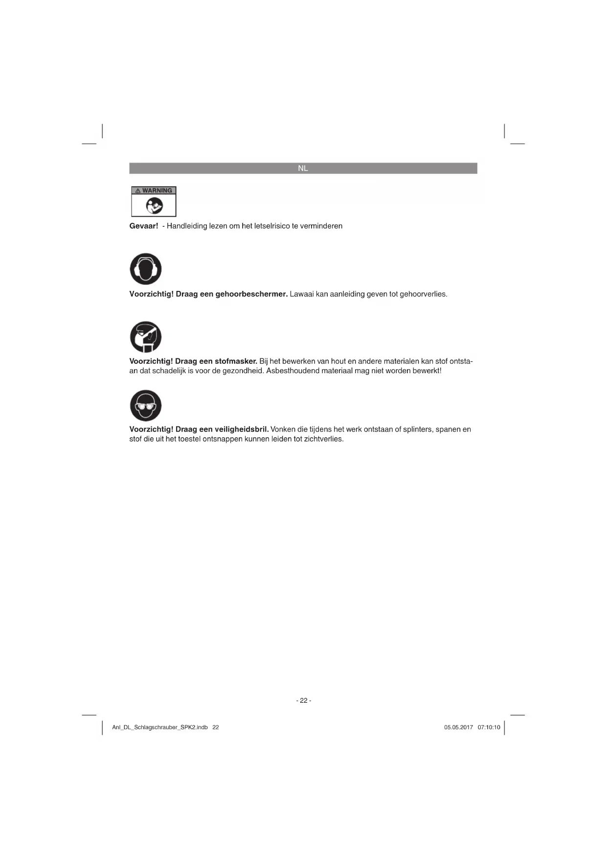 Gevaar! - Handleiding lezen om het letselrisico te verminderen Voorzichtig! Draag een gehoorbeschermer. Lawaai kan aanleiding geven tot gehoorverlies. Voorzichtig! Draag een veiligheidsbril. Vonken die tijdens het werk ontstaan of splinters, spanen en stof die uit het toestel ontsnappen kunnen leiden tot zichtverlies. Voorzichtig! Draag een stofmasker. Bij het bewerken van hout en andere materialen kan stof ontsta- an dat schadelijk is voor de gezondheid. Asbesthoudend materiaal mag niet worden bewerkt! Anl_DL_Schlagschrauber_SPK2.indb 22Anl_DL_Schlagschrauber_SPK2.indb 22 05.05.2017 07:10:1005.05.2017 07:10:10NL
