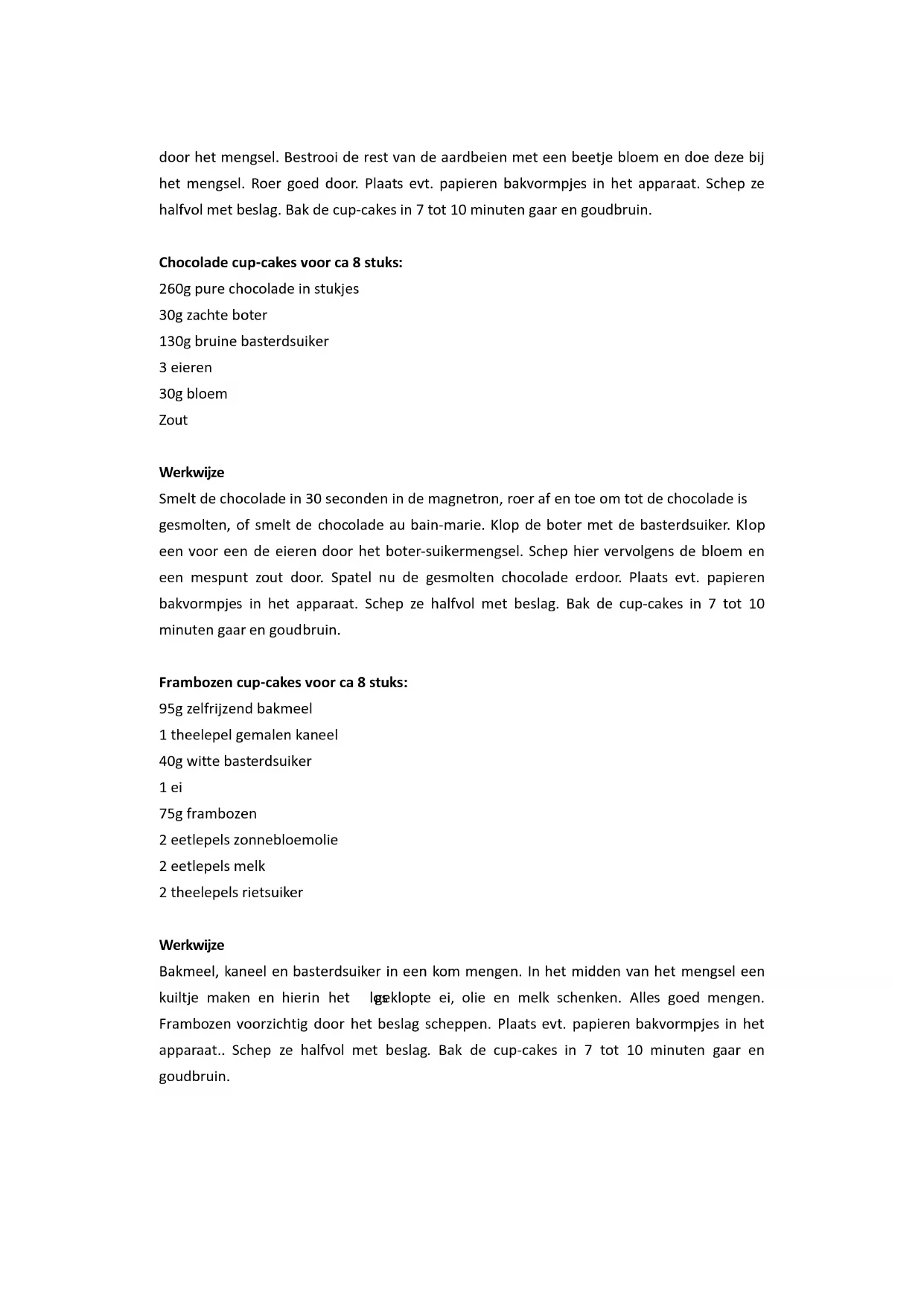 door het mengsel. Bestrooi de rest van de aardbeien met een beetje bloem en doe deze bij het mengsel. Roer goed door. Plaats evt. papieren bakvormpjes in het apparaat. Schep ze halfvol met beslag. Bak de cup-cakes in 7 tot 10 minuten gaar en goudbruin.
