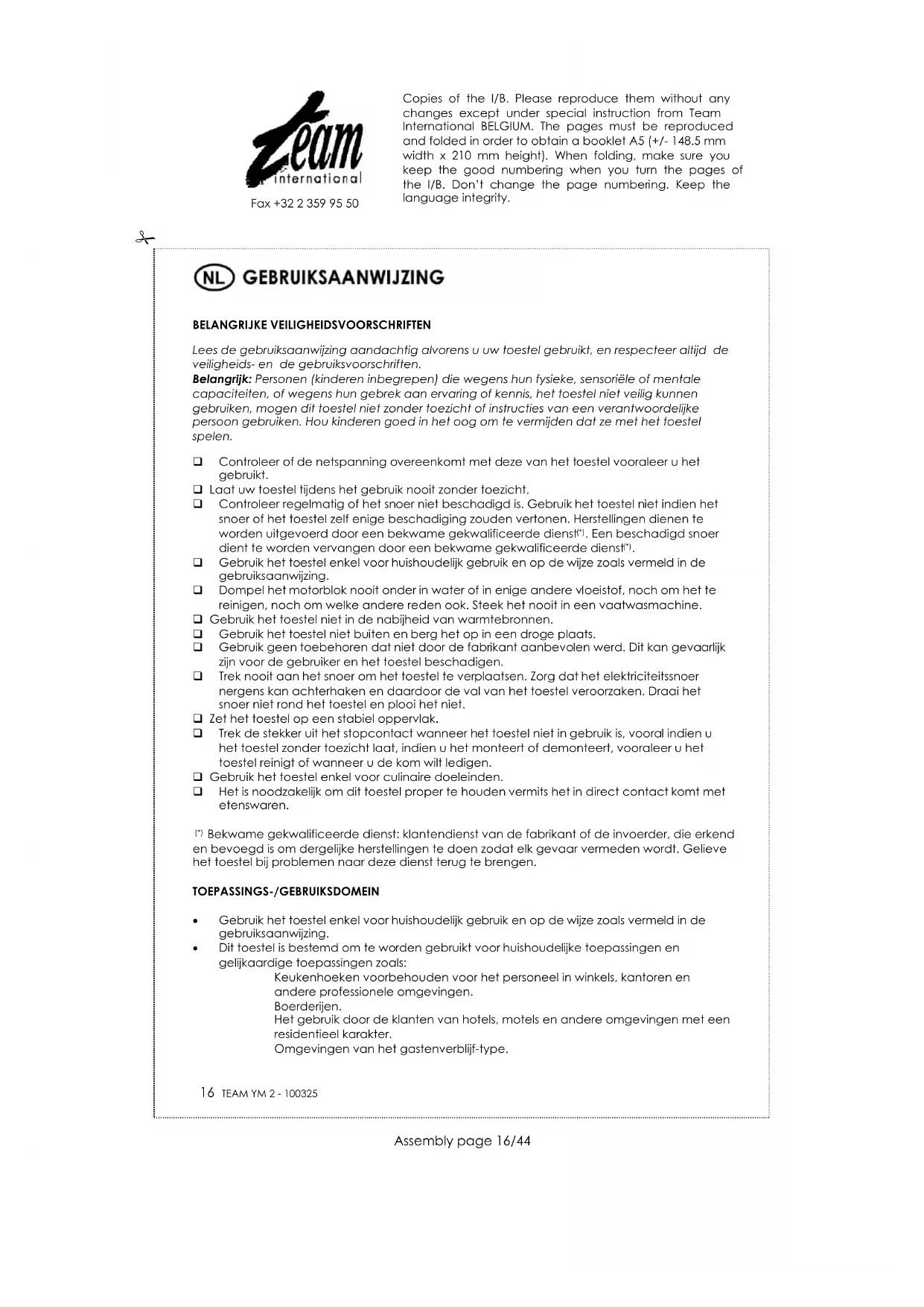 Om ons milieu en onze gezondheid te beschermen, moet afgedankte elektrische en elektronische apparatuur in overeenstemming met welbepaalde regels weggegooid worden. Dit vergt zowel de inzet van de leveranciers als van de gebruikers. Om deze reden mag uw apparaat, zoals op het typeplaatje of op de verpakking aangegeven door het symbool , niet met het gewone huisvuil weggegooid worden. De gebruiker heeft het recht het toestel gratis naar een gemeentelijk centrum van gescheiden inzameling te brengen waar het overeenkomstig de richtlijn hergebruikt, gerecycleerd of voor andere doeleinden gebruikt zal worden. Copies of the I/B. Please reproduce them without any changes except under special instruction from Team International BELGIUM. The pages must be reproduced and folded in order to obtain a booklet A5 (+/- 148.5 mm width x 210 mm height). When folding, make sure you keep the good numbering when you turn the pages of the I/B. Don’t change the page numbering. Keep the language integrity.