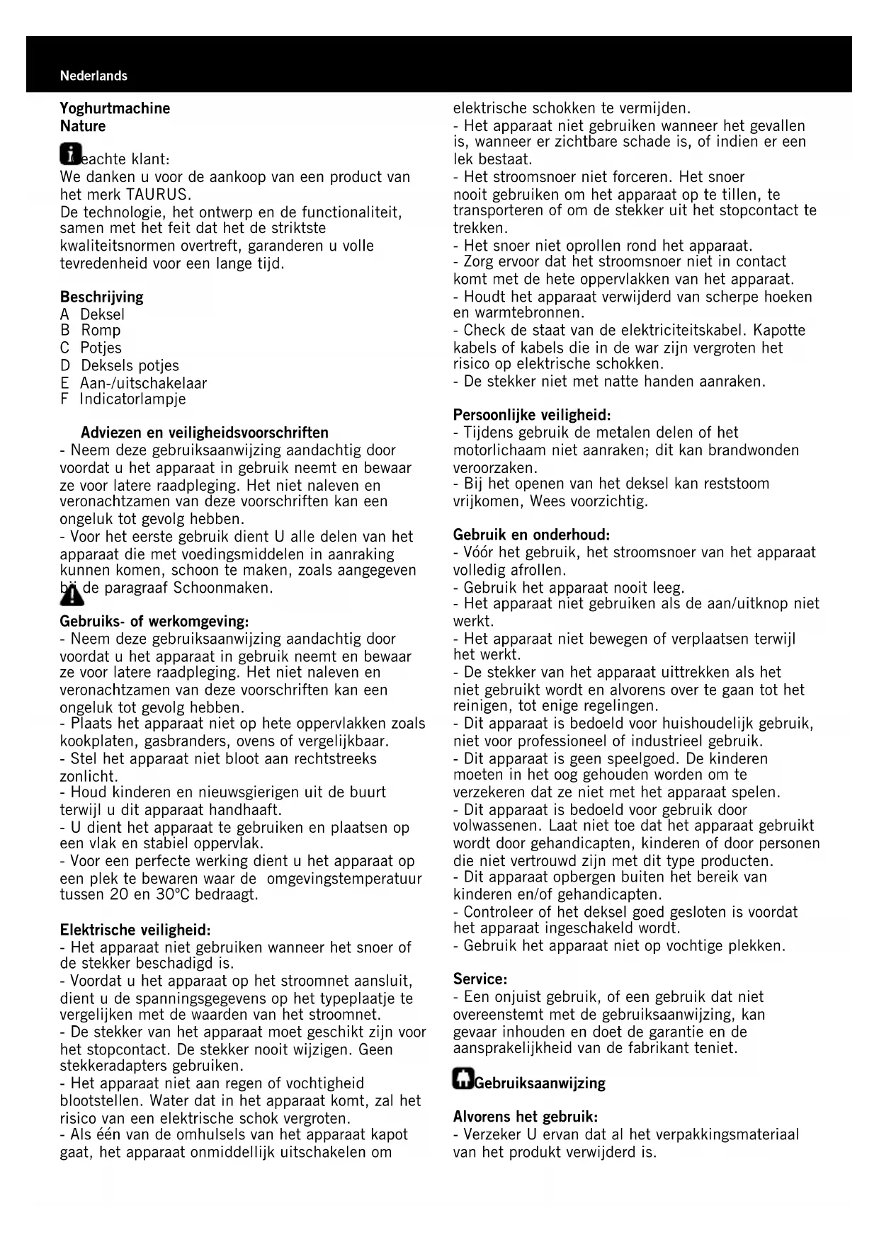 - 4 colheres de sopa de marmelada. Deitar o iogurte ou o fermento num recipiente. Adicionar o xarope e deitar o leite pouco a pouco, sem deixar de misturar a preparação. Deitar o preparado nos frascos. Deitar o iogurte ou o fermento num recipiente e misturar com o leite. Deitar o preparado nos frascos. Cortar as rodelas aos quadrados e distribui-las nos frascos. Deitar o iogurte ou fermento num recipiente e adicionar o leite e o sumo pouco a pouco. Deitar o preparado nos frascos. Opções: também pode utilizar morangos (10 unidades), tangerinas (4 unidades), laranja (1 unidade), banana (1 unidade). Deitar cuidadosamente o chocolate ou chicória num recipiente, adicionar um copo de leite morno e misturar, adicionar o iogurte ou fermento e o resto do leite sem deixar de misturar. Deitar o preparado nos frascos. Misturar a marmelada com um pouco de leite num recipiente, deitar o iogurte ou o fermento, misturar, adicionar o resto do leite e misturar. Deitar o preparado nos frascos. RECEITAYoghurtmachine Nature Geachte klant: We danken u voor de aankoop van een product van het merk TAURUS. De technologie, het ontwerp en de functionaliteit, samen met het feit dat het de striktste kwaliteitsnormen overtreft, garanderen u volle tevredenheid voor een lange tijd. Beschrijving A Deksel B Romp C Potjes D Deksels potjes E Aan-/uitschakelaar F Indicatorlampje Adviezenenveiligheidsvoorschriften - Neem deze gebruiksaanwijzing aandachtig door voordat u het apparaat in gebruik neemt en bewaar ze voor latere raadpleging. Het niet naleven en veronachtzamen van deze voorschriften kan een ongeluk tot gevolg hebben. - Voor het eerste gebruik dient U alle delen van het apparaat die met voedingsmiddelen in aanraking kunnen komen, schoon te maken, zoals aangegeven bij de paragraaf Schoonmaken. Gebruiks-ofwerkomgeving: - Neem deze gebruiksaanwijzing aandachtig door voordat u het apparaat in gebruik neemt en bewaar ze voor latere raadpleging. Het niet naleven en veronachtzamen van deze voorschriften kan een ongeluk tot gevolg hebben. - Plaats het apparaat niet op hete oppervlakken zoals kookplaten, gasbranders, ovens of vergelijkbaar. - Stel het apparaat niet bloot aan rechtstreeks zonlicht. - Houd kinderen en nieuwsgierigen uit de buurt terwijl u dit apparaat handhaaft. - U dient het apparaat te gebruiken en plaatsen op een vlak en stabiel oppervlak. - Voor een perfecte werking dient u het apparaat op een plek te bewaren waar de omgevingstemperatuur tussen 20 en 30ºC bedraagt. Elektrischeveiligheid: - Het apparaat niet gebruiken wanneer het snoer of de stekker beschadigd is. - Voordat u het apparaat op het stroomnet aansluit, dient u de spanningsgegevens op het typeplaatje te vergelijken met de waarden van het stroomnet. - De stekker van het apparaat moet geschikt zijn voor het stopcontact. De stekker nooit wijzigen. Geen stekkeradapters gebruiken. - Het apparaat niet aan regen of vochtigheid blootstellen. Water dat in het apparaat komt, zal het risico van een elektrische schok vergroten. - Als één van de omhulsels van het apparaat kapot gaat, het apparaat onmiddellijk uitschakelen om elektrische schokken te vermijden. - Het apparaat niet gebruiken wanneer het gevallen is, wanneer er zichtbare schade is, of indien er een lek bestaat. - Het stroomsnoer niet forceren. Het snoer nooit gebruiken om het apparaat op te tillen, te transporteren of om de stekker uit het stopcontact te trekken. - Het snoer niet oprollen rond het apparaat. - Zorg ervoor dat het stroomsnoer niet in contact komt met de hete oppervlakken van het apparaat. - Houdt het apparaat verwijderd van scherpe hoeken en warmtebronnen. - Check de staat van de elektriciteitskabel. Kapotte kabels of kabels die in de war zijn vergroten het risico op elektrische schokken. - De stekker niet met natte handen aanraken. Persoonlijkeveiligheid: - Tijdens gebruik de metalen delen of het motorlichaam niet aanraken; dit kan brandwonden veroorzaken. - Bij het openen van het deksel kan reststoom vrijkomen, Wees voorzichtig. Gebruikenonderhoud: - Vóór het gebruik, het stroomsnoer van het apparaat volledig afrollen. - Gebruik het apparaat nooit leeg. - Het apparaat niet gebruiken als de aan/uitknop niet werkt. - Het apparaat niet bewegen of verplaatsen terwijl het werkt. - De stekker van het apparaat uittrekken als het niet gebruikt wordt en alvorens over te gaan tot het reinigen, tot enige regelingen. - Dit apparaat is bedoeld voor huishoudelijk gebruik, niet voor professioneel of industrieel gebruik. - Dit apparaat is geen speelgoed. De kinderen moeten in het oog gehouden worden om te verzekeren dat ze niet met het apparaat spelen. - Dit apparaat is bedoeld voor gebruik door volwassenen. Laat niet toe dat het apparaat gebruikt wordt door gehandicapten, kinderen of door personen die niet vertrouwd zijn met dit type producten. - Dit apparaat opbergen buiten het bereik van kinderen en/of gehandicapten. - Controleer of het deksel goed gesloten is voordat het apparaat ingeschakeld wordt. - Gebruik het apparaat niet op vochtige plekken. Service: - Een onjuist gebruik, of een gebruik dat niet overeenstemt met de gebruiksaanwijzing, kan gevaar inhouden en doet de garantie en de aansprakelijkheid van de fabrikant teniet. Gebruiksaanwijzing Alvorenshetgebruik: - Verzeker U ervan dat al het verpakkingsmateriaal van het produkt verwijderd is. Nederlands- Voor het eerste gebruik dient U alle delen van het apparaat die met voedingsmiddelen in aanraking kunnen komen, schoon te maken, zoals aangegeven bij de paragraaf Schoonmaken. - Om yoghurt te maken heeft u één liter melk en ferment nodig. *Keuzevandemelk: - Gebruik bij voorkeur volle of halfvolle melk (UHT gesteriliseerde melk of melkpoeder). U dient deze melk niet te koken voor gebruik. Gebruik geen magere melk. - Volle melk bevat meer ferment en aroma. - U dient verse en gepasteuriseerde melk te koken voor gebruik. Daarna laat u de melk afkoelen en verwijdert u de room. Deze twee soorten melk bevatten meer vitamines en 
