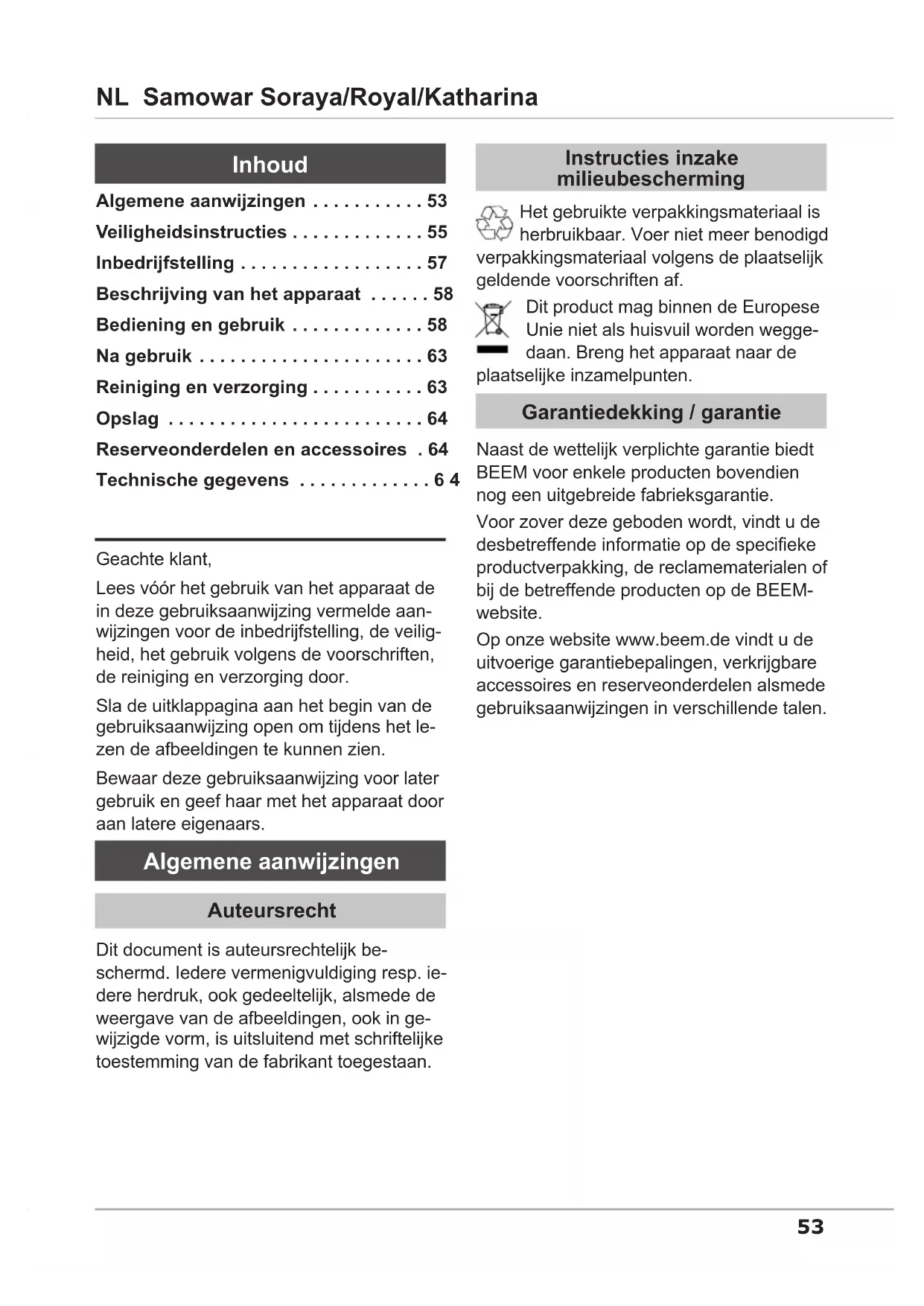 - Reserveonderdelen en accessoires . 64 Technische gegevens Inhoud54 Samowar Soraya/Royal/Katharina NL WAARSCHUWING In geval van oneigenlijk gebruik en/ of niet voorzien gebruik van het appa- raat kunnen van het apparaat gevaren uitgaan. Het apparaat mag uitsluitend voor ► het beoogde, toegelaten gebruiks- doel worden gebruikt. Leef de in deze gebruiksaanwijzing ► beschreven voorschriften na. Claims en reclamaties van welke aard dan ook, die te herleiden zijn tot verkeerd of on- eigenlijk gebruik, worden niet aanvaard. Het risico berust dan uitsluitend bij de ge- bruiker. Beperking van de aansprakelijkheid Wij aanvaarden geen aansprakelijkheid voor schades of vervolgschades in geval- len: waarbij de bedieningshandleiding niet in ■ acht genomen is, niet-reglementair gebruik, ■ van een inadequate of onjuiste behan- ■ deling, van niet deskundig uitgevoerde repa- ■ raties, van niet door ons geautoriseerde modi- ■ caties, waarbij onderdelen of vervangende on- ■ derdelen van derden werden gebruikt, waarbij ongeschikte aanvullende onder- ■ delen of accessoires werden gebruikt. Conformiteitsverklaring Bij deze verklaart BEEM dat dit apparaat aan de principiële eisen en de overige van toepassing zijnde bepalingen van de richt- lijn 2006/95/EG, 2004/108/EG en 2009/125/ EG voldoet. Gebruikte symbolen GeVAAR Wordt gebruikt voor een onmiddellijk dreigend gevaar dat ernstig of dodelijk lichamelijk letsel tot gevolg kan hebben. Ter voorkoming van het gevaar ► moeten de hier vermelde instructies worden nageleefd. WAARSCHUWING Wordt gebruikt voor een mogelijk ge- vaarlijke situatie die ernstig of dodelijk lichamelijk letsel zou kunnen veroorza- ken. Ter voorkoming van het gevaar ► moeten de hier vermelde instructies worden nageleefd. LET OP Wordt gebruikt voor een mogelijke gevaarlijke situatie die lichte lichamelijke letsels of materiële schade kan veroor- zaken. Ter voorkoming van het gevaar ► moeten de hier vermelde instructies worden nageleefd. AANWIJZING Een opmerking bevat verdere ► informatie die de omgang met het apparaat eenvoudiger kan maken. Gebruik volgens de voorschriften Dit apparaat is vooral bestemd voor com- mercieel gebruik in hotels, pensions enz. voor de bereiding van thee en andere hete dranken. Een ander of daar bovenuit gaand gebruik geldt als oneigenlijk, niet toegelaten ge- bruik.55 NL Samowar Soraya/Royal/Katharina Veiligheidsinstructies Controleer het apparaat vóór gebruik op ■ zichtbare externe schade. Neem een beschadigd apparaat niet in gebruik. Dit apparaat is er niet voor bedoeld om ■ door personen (ook kinderen) met licha- melijke, sensorische of geestelijke be- perkingen of met ontbrekende ervaring en/of kennis gebruikt te worden, tenzij deze onder toezicht staan van een voor hun veiligheid verantwoordelijke per- soon of van deze persoon instructies hebben verkregen hoe het apparaat moet worden bediend. Kinderen moeten onder toezicht staan ■ om ervoor te zorgen dat ze niet met het apparaat kunnen spelen. Berg het apparaat en de accessoires ■ buiten bereik van kinderen op. Laat het apparaat tijdens het gebruik ■ niet onbeheerd achter. Laat reparaties aan het apparaat alleen ■ door hiervoor geautoriseerde hande- laars of door de klantenservice uitvoe- ren; dit geldt vooral voor de vervanging van een beschadigde aansluitkabel. Door ondeskundige reparaties kunnen er aanzienlijke gevaren voor de gebrui- ker ontstaan. Bovendien vervalt daar- door de garantie resp. garantiedekking. Een reparatie van het apparaat gedu- ■ rende de garantieperiode mag alleen door een door de fabrikant hiervoor geautoriseerde klantenservice worden uitgevoerd, anders is er in geval van be- schadigingen en daaruit voortkomende storingen geen waarborging of garantie meer van toepassing. Defecte onderdelen mogen alleen ■ door originele vervangingsonderdelen worden vervangen. Alleen bij deze onderdelen is gewaarborgd dat aan de veiligheidseisen is voldaan. Gebruik alleen de accessoires en ac- ■ cessoires van de producent of door hem uitdrukkelijk aanbevolen accessoires. Anders vervalt daardoor de garantie resp. garantiedekking. Gebruik dit apparaat niet in combinatie ■ met een externe tijdschakelklok of een afzonderlijk afstandsbedieningssy- steem. GeVAAR Gevaar door elektrische stroom! Gebruik het apparaat niet, wanneer ► de voedingskabel of de stekker beschadigd zijn. Open in geen geval de behuizing ► van het apparaat. Wanneer er onder spanning staande aansluitingen worden aangeraakt en de elektrische en mechanische opbouw worden gewijzigd, bestaat er een verhoogd risico op elektrische schokken. Dompel het apparaat of de netstek- ► ker nooit in water of andere vloeistof- fen. Trek de stekker uit het stopcontact, ► wanneer u het apparaat niet ge- – bruikt, wanneer tijdens het gebruik een – storing optreedt, voordat u het apparaat reinigt. – Gevaar voor verstikking! Verpakkingsmateriaal mag niet als ► speelgoed worden gebruikt. Kinde- ren kunnen erin stikken.56 Samowar Soraya/Royal/Katharina NL WAARSCHUWING Verhit in het apparaat nooit andere ► vloeistoffen dan water. Gevaar door hete stoom of heet water! Vul het apparaat nooit verder dan de ► maximum-markering. Open niet het deksel van het water- ► reservoir, terwijl het water kookt. Eruit spattend heet water en stoom kunnen brandwonden tot gevolg hebben. Gezondheidsgevaar door kiemen! Het waterreservoir van het apparaat ► moet met regelmatige tussenpozen volledig leeggemaakt, gereinigd en gedesinfecteerd worden om ge- zondheidsrisico's door de groei van kiemen te vermijden. LET OP Gebruik voor het reinigen van de ► oppervlakken geen scherpe voor- werpen of schurende schoonmaak- middelen. Het apparaat mag niet aan de netka- ► bel gedragen, opgetild of verplaatst worden. Trek de aansluitkabel altijd aan de ► stekker uit het stopcontact, niet aan de voedingskabel zelf. Laat het apparaat niet draaien als de ► kommen leeg zijn. Eisen aan de opstellingsplek Voor een veilige en
