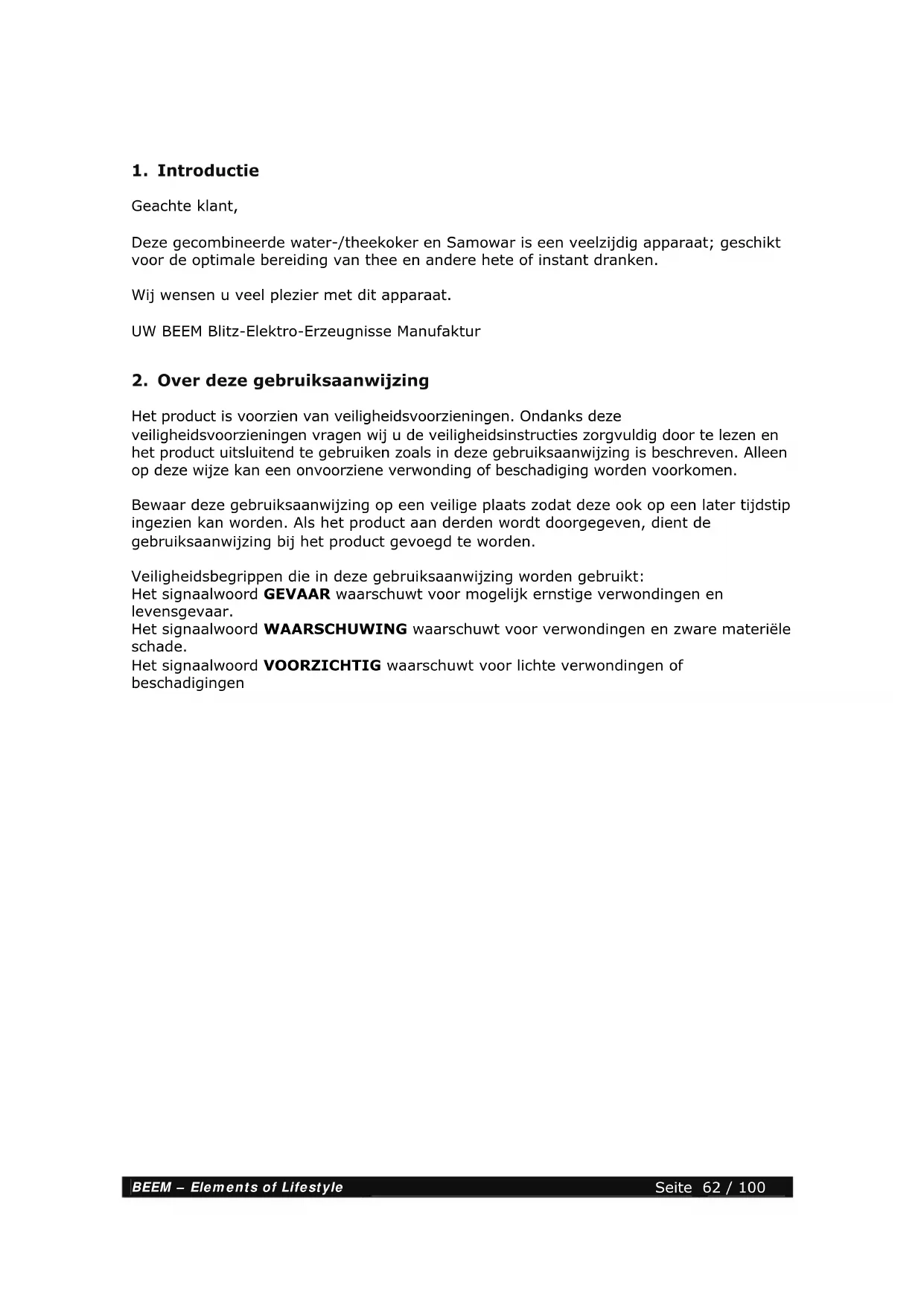 Het product is voorzien van veiligheidsvoorzieningen. Ondanks deze veiligheidsvoorzieningen vragen wij u de veiligheidsinstructies zorgvuldig door te lezen en het product uitsluitend te gebruiken zoals in deze gebruiksaanwijzing is beschreven. Alleen op deze wijze kan een onvoorziene verwonding of beschadiging worden voorkomen. Bewaar deze gebruiksaanwijzing op een veilige plaats zodat deze ook op een later tijdstip ingezien kan worden. Als het product aan derden wordt doorgegeven, dient de gebruiksaanwijzing bij het product gevoegd te worden. Veiligheidsbegrippen die in deze gebruiksaanwijzing worden gebruikt: Het signaalwoord GEVAAR waarschuwt voor mogelijk ernstige verwondingen en levensgevaar. Het signaalwoord WAARSCHUWING waarschuwt voor verwondingen en zware materiële schade. Het signaalwoord VOORZICHTIG waarschuwt voor lichte verwondingen of beschadigingenBEEM – Elements of Lifestyle Seite 63 / 100