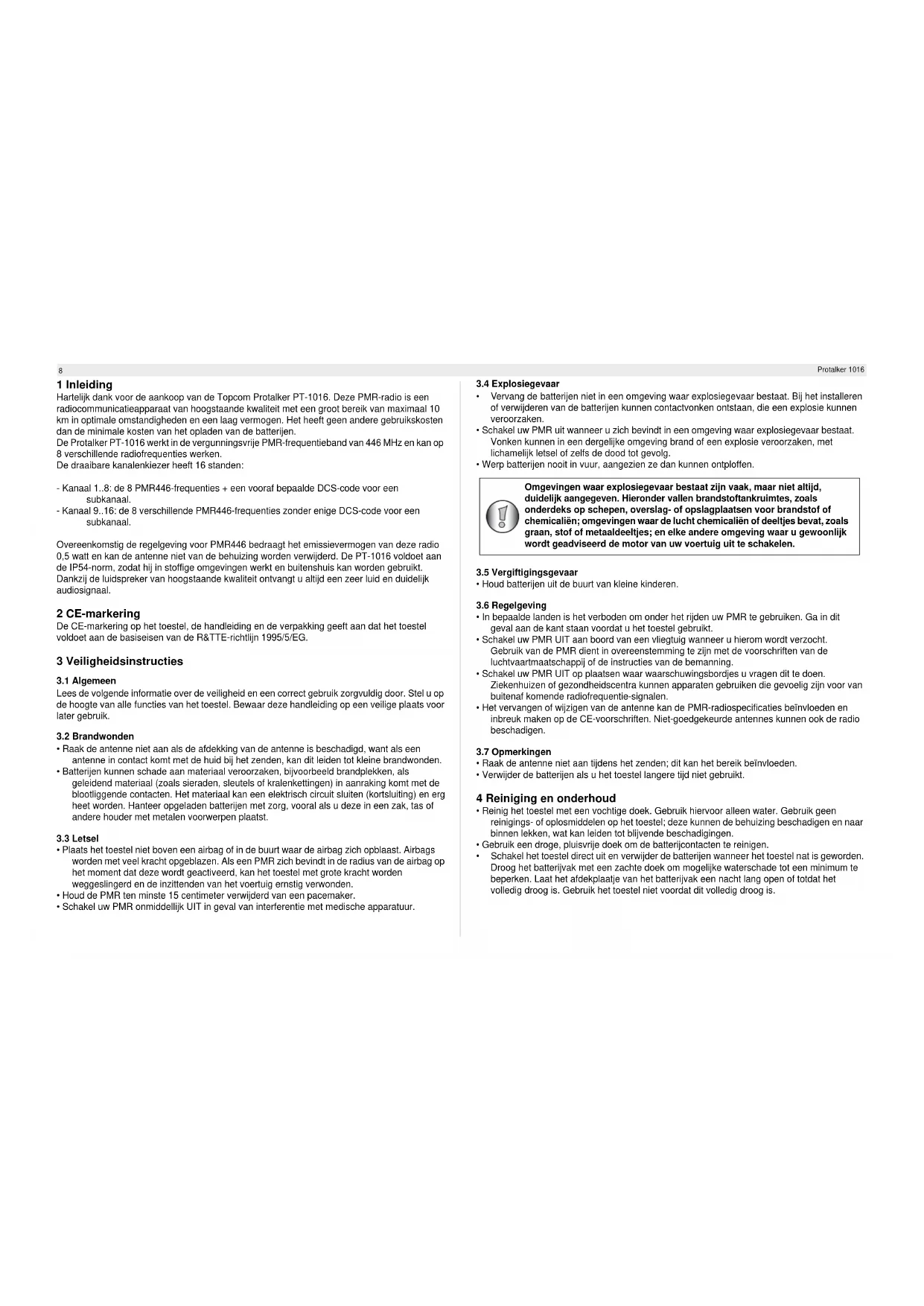 Damage or defects caused by incorrect treatment or operation and damage resulting from use of non-original parts or accessories are not covered by the warranty. The warranty does not cover damage caused by outside factors, such as lightning, water and fire, nor any damage caused during transportation. No warranty can be claimed if the serial number on the units has been changed, removed or rendered illegible. Any warranty claims will be invalid if the unit has been repaired, altered or modified by the buyer8 Protalker 1016 1 Inleiding Hartelijk dank voor de aankoop van de Topcom Protalker PT-1016. Deze PMR-radio is een radiocommunicatieapparaat van hoogstaande kwaliteit met een groot bereik van maximaal 10 km in optimale omstandigheden en een laag vermogen. Het heeft geen andere gebruikskosten dan de minimale kosten van het opladen van de batterijen. De Protalker PT-1016 werkt in de vergunningsvrije PMR-frequentieband van 446 MHz en kan op 8 verschillende radiofrequenties werken. De draaibare kanalenkiezer heeft 16 standen: - Kanaal 1..8: de 8 PMR446-frequenties + een vooraf bepaalde DCS-code voor een subkanaal. - Kanaal 9..16: de 8 verschillende PMR446-frequenties zonder enige DCS-code voor een subkanaal. Overeenkomstig de regelgeving voor PMR446 bedraagt het emissievermogen van deze radio 0,5 watt en kan de antenne niet van de behuizing worden verwijderd. De PT-1016 voldoet aan de IP54-norm, zodat hij in stoffige omgevingen werkt en buitenshuis kan worden gebruikt. Dankzij de luidspreker van hoogstaande kwaliteit ontvangt u altijd een zeer luid en duidelijk audiosignaal. 2 CE-markering De CE-markering op het toestel, de handleiding en de verpakking geeft aan dat het toestel voldoet aan de basiseisen van de R&TTE-richtlijn 1995/5/EG. 3 Veiligheidsinstructies