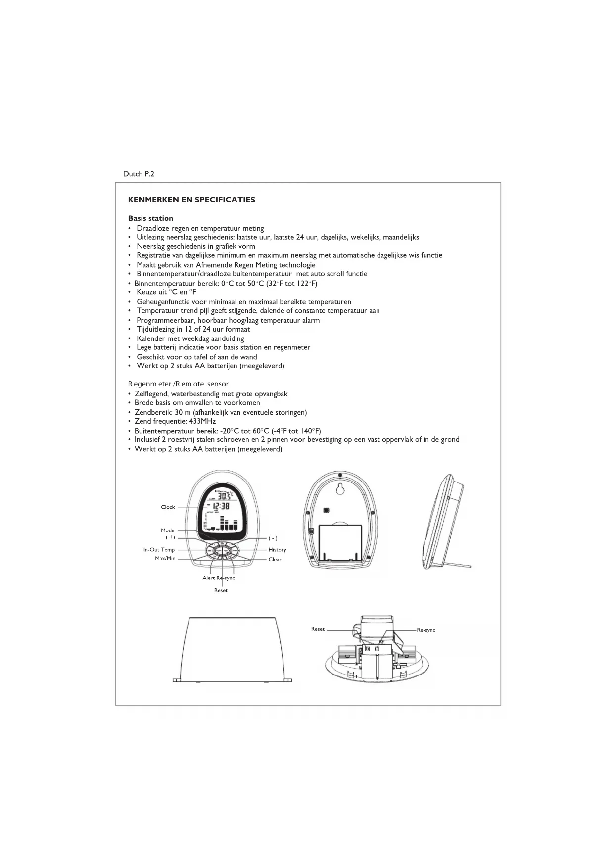 In de linkerbovenhoek van de display op het basis station wordt het [ ] icoon getoond, ten teken dat de regenmeter een signal overzendaet. Als de OUT temperatuur Niet worden weergegeven binnen 6 minutes na een reset, drukt u op de RE-SYNC toets, het basis station zoekt dan opnieuw gedurende 6 minutesaar het radio signal van de regenmeter. Als de OUT temperatuur dan nog Niet in de display verschijnt, verwijzen wij u aan het hoofdstuk VERLIES VAN SYNCHRONISATIE.