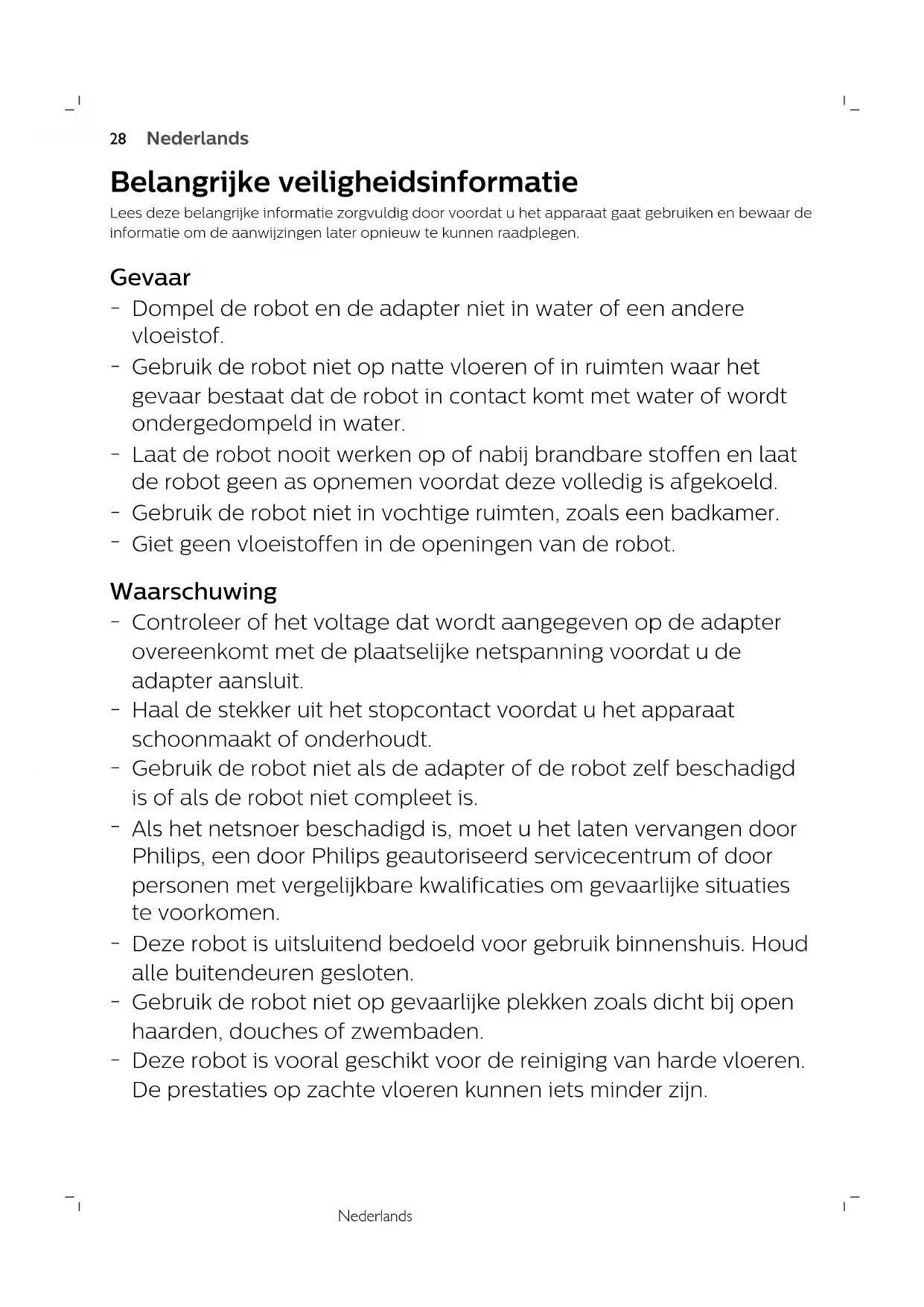 Nederlands- De accu mag alleen worden vervangen door gekwalificeerde onderhoudstechnici. Breng de robot naar een door Philips geautoriseerd servicecentrum om de accu te laten vervangen wanneer u de accu niet meer kunt opladen of wanneer de accu snel leegraakt.