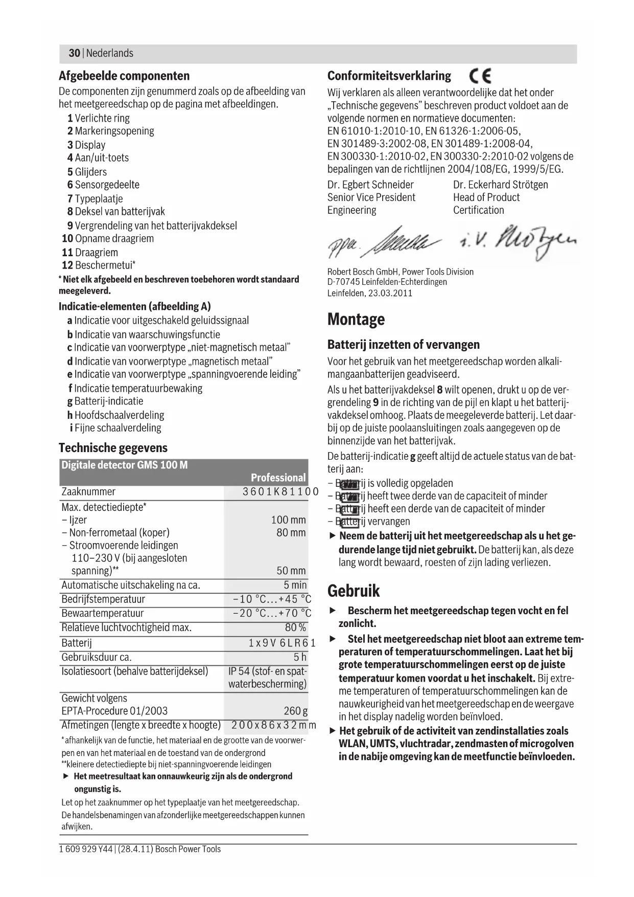 - Niet elk afgebeeld en beschreven toebehoren wordt standaard meegeleverd. Indicatie-elementen (afbeelding A) a Indicatie voor uitgeschakeld geluidssignaal b Indicatie van waarschuwingsfunctie c Indicatie van voorwerptype „niet-magnetisch metaal” d Indicatie van voorwerptype „magnetisch metaal” e Indicatie van voorwerptype „spanningvoerende leiding” f Indicatie temperatuurbewaking g Batterij-indicatie h Hoofdschaalverdeling i Fijne schaalverdeling Technische gegevens Conformiteitsverklaring Wij verklaren als alleen verantwoordelijke dat het onder „Technische gegevens” beschreven product voldoet aan de volgende normen en normatieve documenten: EN 61010-1:2010-10, EN 61326-1:2006-05, EN 301489-3:2002-08, EN 301489-1:2008-04, EN 300330-1:2010-02, EN 300330-2:2010-02 volgens de bepalingen van de richtlijnen 2004/108/EG, 1999/5/EG. Robert Bosch GmbH, Power Tools Division D-70745 Leinfelden-Echterdingen Leinfelden, 23.03.2011 Montage Batterij inzetten of vervangen Voor het gebruik van het meetgereedschap worden alkali- mangaanbatterijen geadviseerd. Als u het batterijvakdeksel 8 wilt openen, drukt u op de ver- grendeling 9 in de richting van de pijl en klapt u het batterij- vakdeksel omhoog. Plaats de meegeleverde batterij. Let daar- bij op de juiste poolaansluitingen zoals aangegeven op de binnenzijde van het batterijvak. De batterij-indicatie g geeft altijd de actuele status van de bat- terij aan: – Batterij is volledig opgeladen – Batterij heeft twee derde van de capaciteit of minder – Batterij heeft een derde van de capaciteit of minder – Batterij vervangen f Neem de batterij uit het meetgereedschap als u het ge- durende lange tijd niet gebruikt. De batterij kan, als deze lang wordt bewaard, roesten of zijn lading verliezen. Gebruik f Bescherm het meetgereedschap tegen vocht en fel zonlicht. f Stel het meetgereedschap niet bloot aan extreme tem- peraturen of temperatuurschommelingen. Laat het bij grote temperatuurschommelingen eerst op de juiste temperatuur komen voordat u het inschakelt. Bij extre- me temperaturen of temperatuurschommelingen kan de nauwkeurigheid van het meetgereedschap en de weergave in het display nadelig worden beïnvloed. f Het gebruik of de activiteit van zendinstallaties zoals WLAN, UMTS, vluchtradar, zendmasten of microgolven in de nabije omgeving kan de meetfunctie beïnvloeden. Digitale detector GMS 100 M Professional Zaaknummer 3601K81100 Max. detectiediepte* – Ijzer – Non-ferrometaal (koper) – Stroomvoerende leidingen 110–230 V (bij aangesloten spanning)** 100 mm 80 mm 50 mm Automatische uitschakeling na ca. 5min Bedrijfstemperatuur –10 °C...+45 °C Bewaartemperatuur –20 °C...+70 °C Relatieve luchtvochtigheid max. 80 % Batterij 1x9V 6LR61 Gebruiksduur ca.