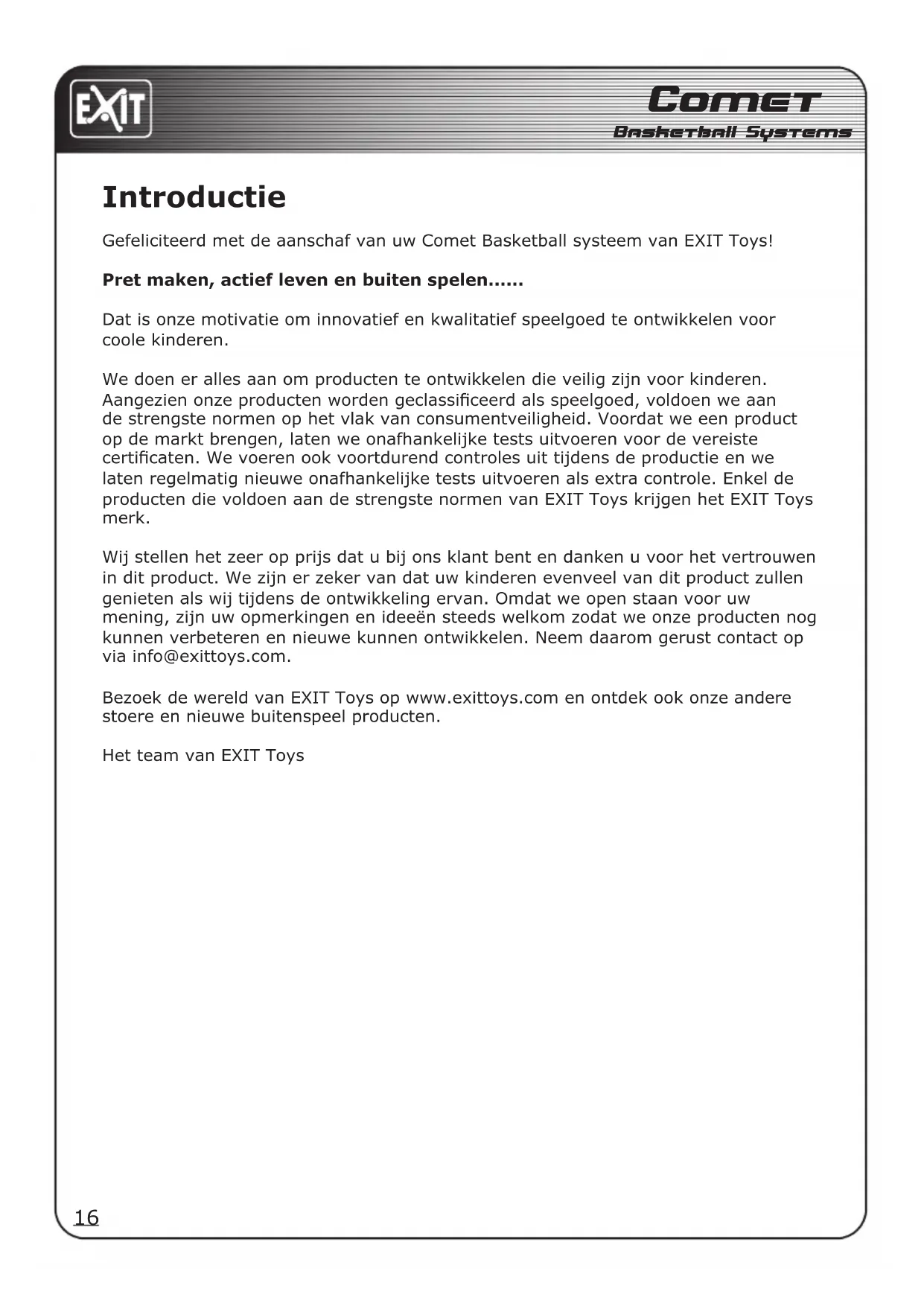 Gefeliciteerd met de aanschaf van uw Comet Basketball systeem van EXIT Toys!