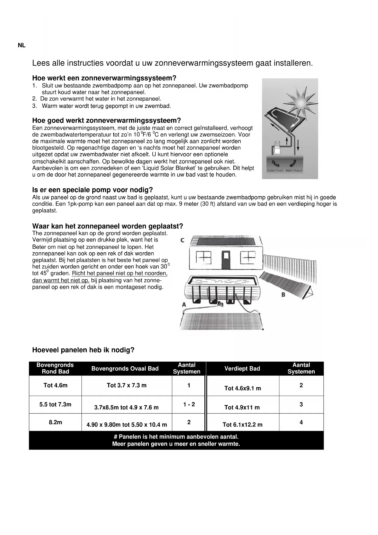 C en verlengt uw zwemseizoen. Voor de maximale warmte moet het zonnepaneel zo lang mogelijk aan zonlicht worden blootgesteld. Op regenachtige dagen en ‘s nachts moet het zonnepaneel worden uitgezet opdat uw zwembadwater niet afkoelt. U kunt hiervoor een optionele omschakelkit aanschaffen. Op bewolkte dagen werkt het zonnepaneel ook niet. Aanbevolen is om een zonnedeken of een ‘Liquid Solar Blanket’ te gebruiken. Dit helpt u om de door het zonnepaneel gegenereerde warmte in uw bad vast te houden. Is er een speciale pomp voor nodig? Als uw paneel op de grond naast uw bad is geplaatst, kunt u uw bestaande zwembadpomp gebruiken mist hij in goede conditie. Een 1pk-pomp kan een paneel aan dat op max. 9 meter (30 ft) afstand van uw bad en een verdieping hoger is geplaatst. Waar kan het zonnepaneel worden geplaatst? The zonnepaneel kan op de grond worden geplaatst. Vermijd plaatsing op een drukke plek, want het is Beter om niet op het zonnepaneel te lopen. Het zonnepaneel kan ook op een rek of dak worden geplaatst. Bij het plaatsten is het beste het paneel op het zuiden worden gericht en onder een hoek van 30