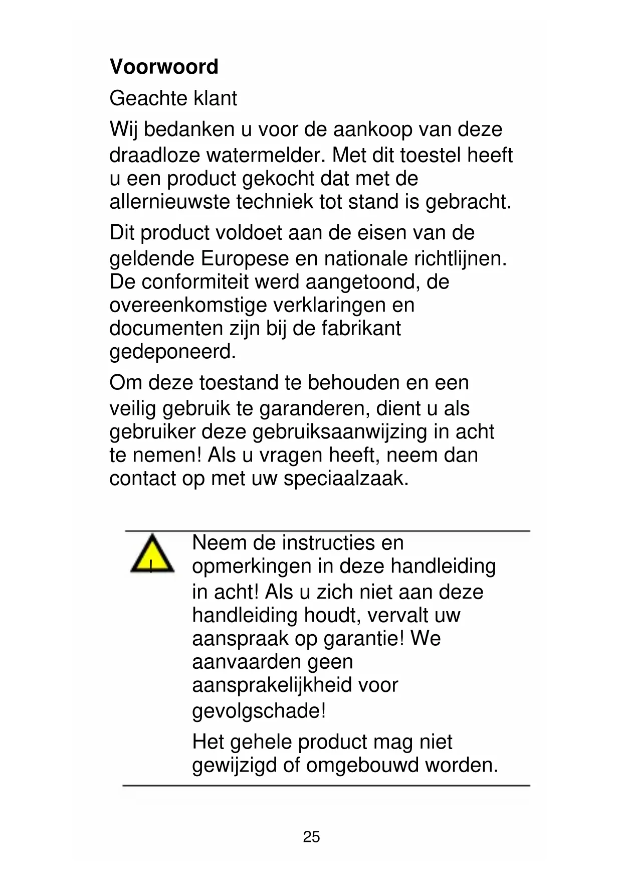 Wij bedanken u voor de aankoop van deze draadloze watermelder. Met dit toestel heeft u een product gekocht dat met de allernieuwste techniek tot stand is gebracht.