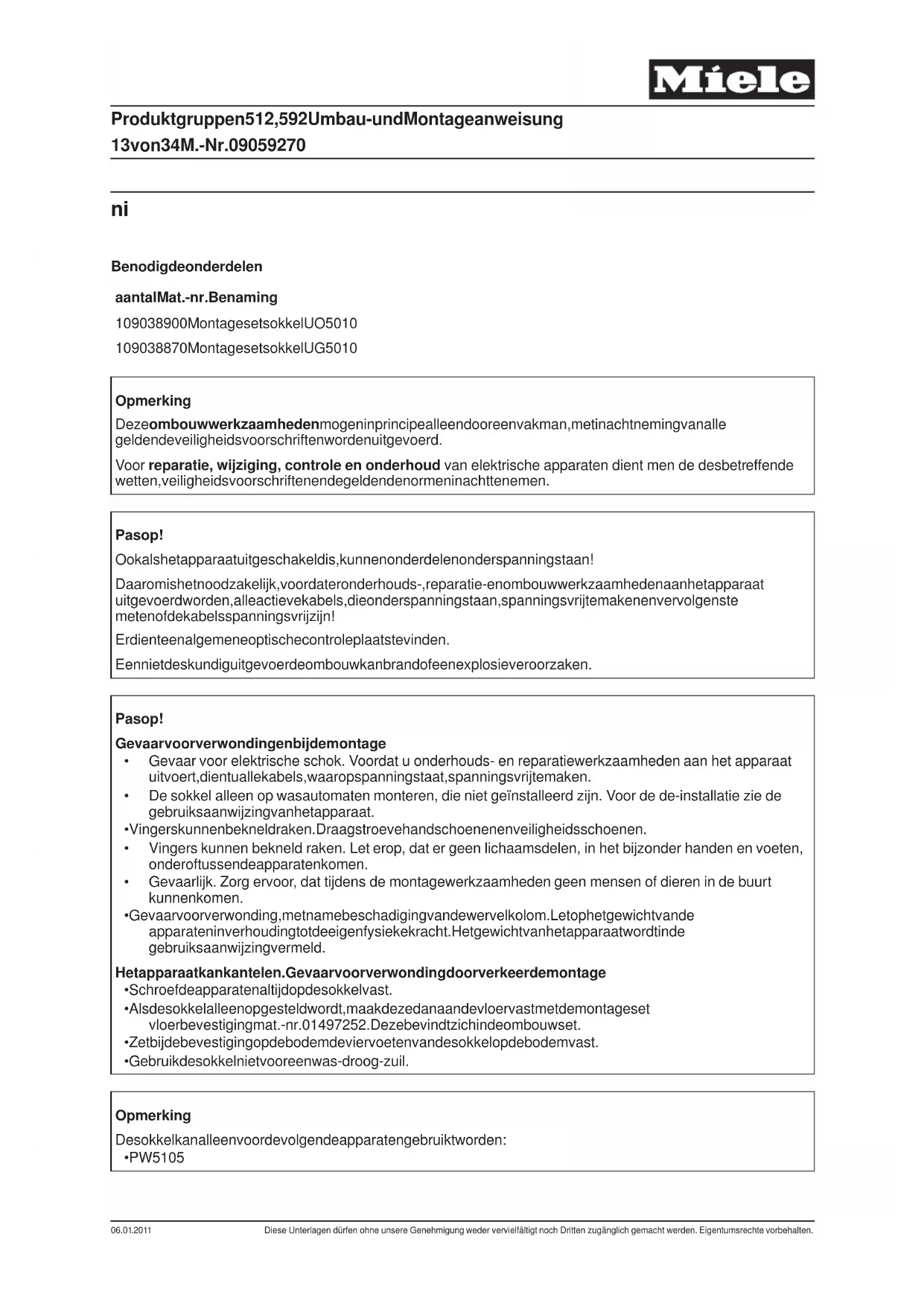 aantal Mat.-nr. Benaming 1 09038900 Montageset sokkel UO 5010 1 09038870 Montageset sokkel UG 5010 Opmerking Deze ombouwwerkzaamheden mogen in principe alleen door een vakman, met inachtneming van alle geldende veiligheidsvoorschriften worden uitgevoerd. Voor reparatie, wijziging, controle en onderhoud van elektrische apparaten dient men de desbetreffende wetten, veiligheidsvoorschriften en de geldende normen in acht te nemen. Pas op! Ook als het apparaat uitgeschakeld is, kunnen onderdelen onder spanning staan! Daarom is het noodzakelijk, voordat er onderhouds-, reparatie- en ombouwwerkzaamheden aan het apparaat uitgevoerd worden, alle actieve kabels, die onder spanning staan, spanningsvrij te maken en vervolgens te meten of de kabels spanningsvrij zijn! Er dient een algemene optische controle plaats te vinden. Een niet deskundig uitgevoerde ombouw kan brand of een explosie veroorzaken. Pas op! Gevaar voor verwondingen bij de montage