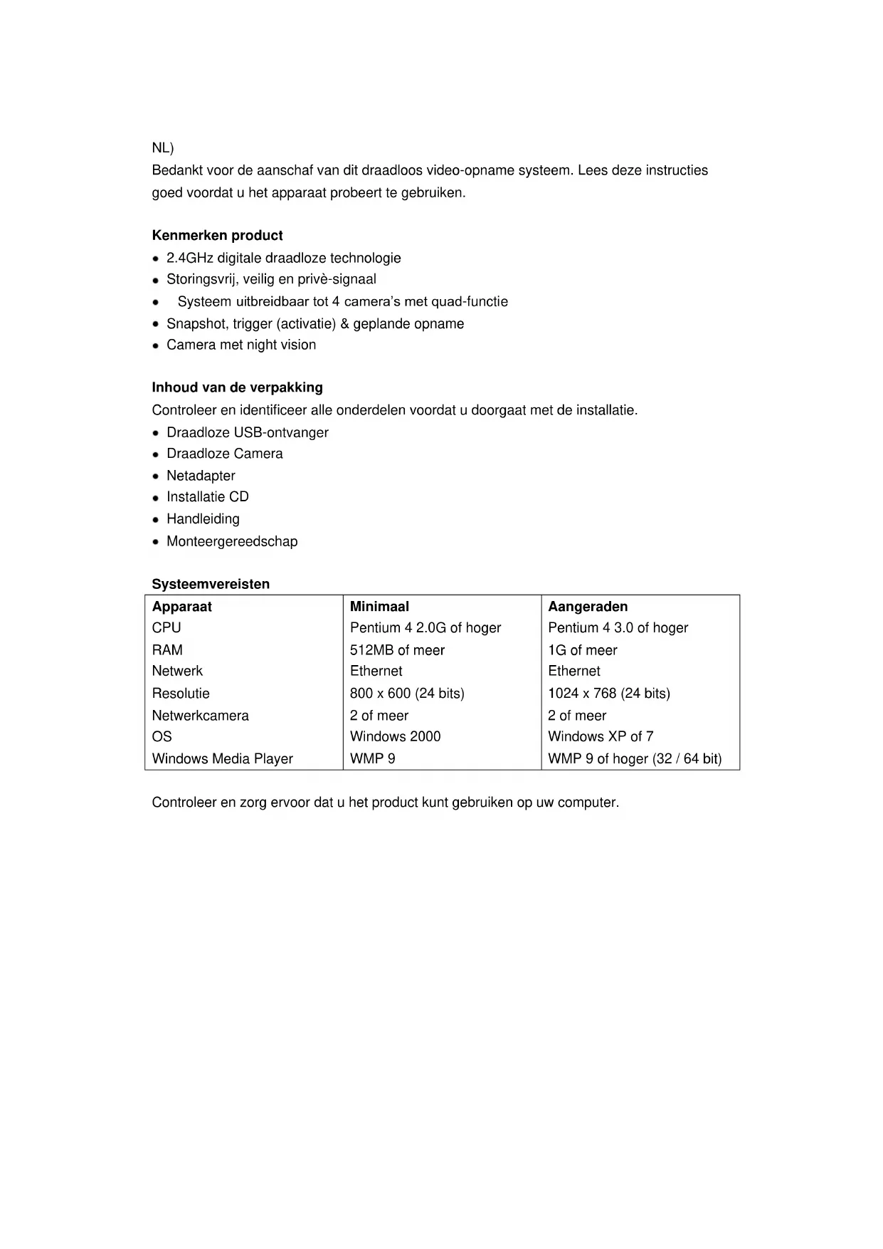 NL) Handleiding digitale draadloze kleurencameraset met USB ontvanger en opnamefunctie DE) Gebrauchsanleitung Digitale Funk-Farbkameraset mit USB-Empfanger und Aufnahmefunktion FR) Mode d’emploi système de caméra en réseau sans-fil GB) Manual digital wireless color camera set with USB receiver and record functionNL) Bedankt voor de aanschaf van dit draadloos video-opname systeem. Lees deze instructies goed voordat u het apparaat probeert te gebruiken. Kenmerken product 2.4GHz digitale draadloze technologie Storingsvrij, veilig en privè-signaal Systeem uitbreidbaar tot 4 camera’s met quad-functie Snapshot, trigger (activatie) & geplande opname Camera met night vision Inhoud van de verpakking Controleer en identificeer alle onderdelen voordat u doorgaat met de installatie. Draadloze USB-ontvanger Draadloze Camera Netadapter Installatie CD Handleiding Monteergereedschap Systeemvereisten Apparaat CPU RAM Netwerk Resolutie Netwerkcamera