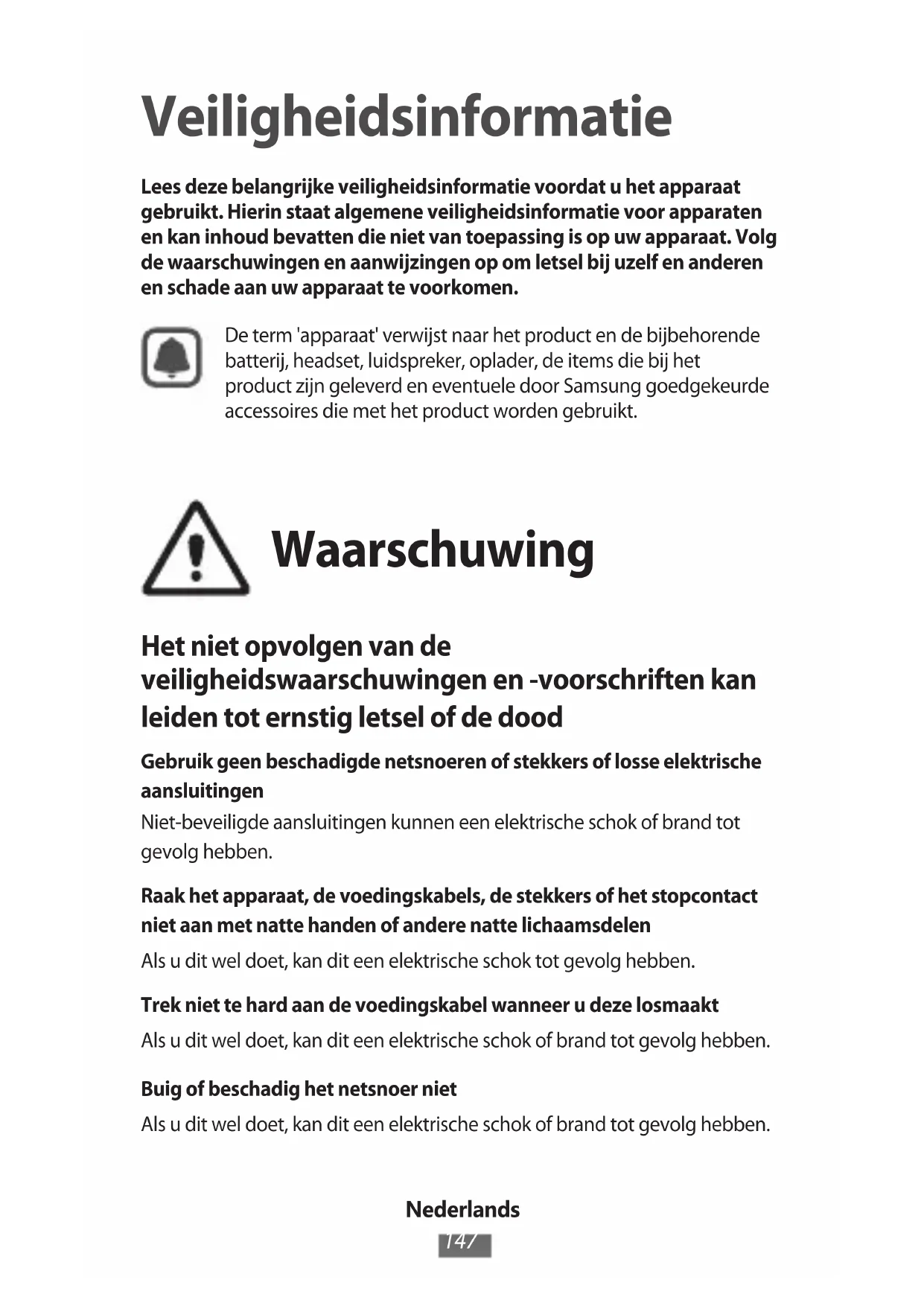 Veiligheidsinformatie Lees deze belangrijke veiligheidsinformatie voordat u het apparaat gebruikt. Hierin staat algemene veiligheidsinformatie voor apparaten en kan inhoud bevatten die niet van toepassing is op uw apparaat. Volg de waarschuwingen en aanwijzingen op om letsel bij uzelf en anderen en schade aan uw apparaat te voorkomen.De term 'apparaat' verwijst naar het product en de bijbehorende batterij, headset, luidspreker, oplader, de items die bij het product zijn geleverd en eventuele door Samsung goedgekeurde accessoires die met het product worden gebruikt. Waarschuwing Het niet opvolgen van de veiligheidswaarschuwingen en -voorschriften kan leiden tot ernstig letsel of de dood Gebruik geen beschadigde netsnoeren of stekkers of losse elektrische aansluitingenNiet-beveiligde aansluitingen kunnen een elektrische schok of brand tot gevolg hebben.Raak het apparaat, de voedingskabels, de stekkers of het stopcontact niet aan met natte handen of andere natte lichaamsdelenAls u dit wel doet, kan dit een elektrische schok tot gevolg hebben.Trek niet te hard aan de voedingskabel wanneer u deze losmaaktAls u dit wel doet, kan dit een elektrische schok of brand tot gevolg hebben.Buig of beschadig het netsnoer nietAls u dit wel doet, kan dit een elektrische schok of brand tot gevolg hebben.Nederlands