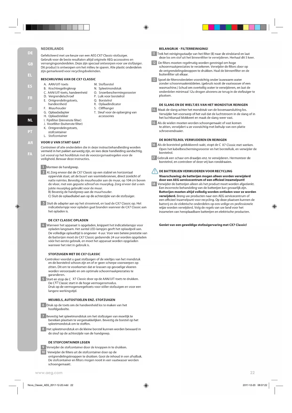 Nova_Classic_AEG_2017-12-20.indd 21 2017-12-20 08:07:22NEDERLANDS Gefeliciteerd met uw keuze van een AEG CX7 Classic-stofzuiger. Gebruik voor de beste resultaten altijd originele AEG-accessoires en vervangingsonderdelen. Deze zijn speciaal ontworpen voor uw stofzuiger. Dit product is ontworpen om het milieu te sparen. Alle plastic onderdelen zijn gemarkeerd voor recyclingdoeleinden.