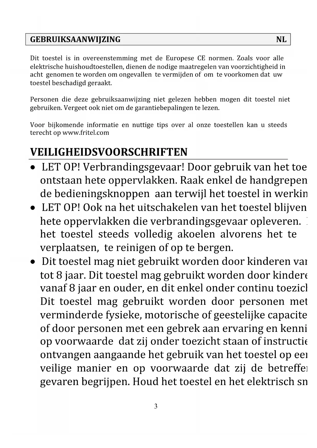 Dit toestel is in overeenstemming met de Europese CE normen. Zoals voor alle elektrische huishoudtoestellen, dienen de nodige maatregelen van voorzichtigheid in acht genomen te worden om ongevallen te vermiijden of om te voorkomen dat uw toestel beschadigd geraakt.