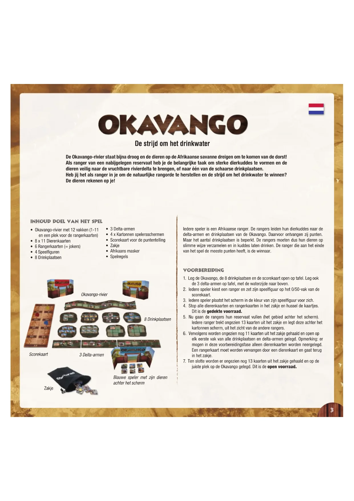 SPIELANLEITUNG · RULES OF THE GAMEDe Okavango-rivier staat bijna droog en de dieren op de Afrikaanse savanne dreigen om te komen van de dorst! Als ranger van een nabijgelegen reservaat heb je de belangrijke taak om sterke dierkuddes te vormen en de dieren veilig naar de vruchtbare rivierdelta te brengen, of naar één van de schaarse drinkplaatsen. Heb jij het als ranger in je om de natuurlijke rangorde te herstellen en de strijd om het drinkwater te winnen? De dieren rekenen op je! De strijd om het drinkwater