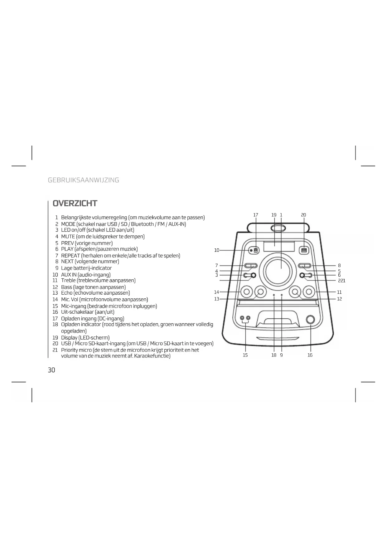 OVERZICHT Belangrijkste volumeregeling (om muziekvolume aan te passen) MODE (schakel naar USB / SD / Bluetooth / FM / AUX-IN) LED on/off (schakel LED aan/uit) MUTE (om de luidspreker te dempen) PREV (vorige nummer) PLAY (afspelen/pauzeren muziek) REPEAT (herhalen om enkele/alle tracks af te spelen) NEXT (volgende nummer) Lage batterij-indicator AUX IN (audio-ingang) Treble (treblevolume aanpassen) Bass (lage tonen aanpassen) Echo (echovolume aanpassen) Mic. Vol (microfoonvolume aanpassen) Mic-ingang (bedrade microfoon inpluggen) Uit-schakelaar (aan/uit) Opladen ingang (DC-ingang) Opladen indicator (rood tijdens het opladen, groen wanneer volledig opgeladen) Display (LED-scherm) USB / Micro SD-kaart-ingang (om USB / Micro SD-kaart in te voegen) Priority micro (de stem uit de microfoon krijgt prioriteit en het volume van de muziek neemt af. Karaokefunctie)