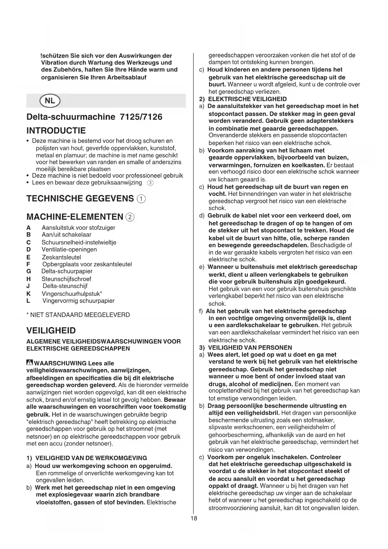 - Nie mit demselben Schleifpapier Holz und Metall bearbeiten18 gereedschappen veroorzaken vonken die het stof of de dampen tot ontsteking kunnen brengen. c) Houd kinderen en andere personen tijdens het gebruik van het elektrische gereedschap uit de buurt. Wanneer u wordt afgeleid, kunt u de controle over het gereedschap verliezen.