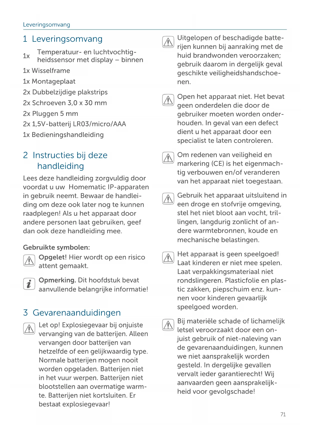 Temperatuur- en luchtvochtig- heidssensor met display – binnen 1x Wisselframe 1x Montageplaat 2x Dubbelzijdige plakstrips 2x Schroeven 3,0 x 30 mm 2x Pluggen 5 mm 2x 1,5V-batterij LR03/micro/AAA 1x Bedieningshandleiding 2 Instructies bij deze handleiding Lees deze handleiding zorgvuldig door voordat u uw HomematicIP-apparaten in gebruik neemt. Bewaar de handlei- ding om deze ook later nog te kunnen raadplegen! Als u het apparaat door andere personen laat gebruiken, geef dan ook deze handleiding mee. Gebruikte symbolen: Opgelet! Hier wordt op een risico attent gemaakt. Opmerking. Dit hoofdstuk bevat aanvullende belangrijke informatie! 3 Gevarenaanduidingen Let op! Explosiegevaar bij onjuiste vervanging van de batterijen. Alleen vervangen door batterijen van hetzelfde of een gelijkwaardig type. Normale batterijen mogen nooit worden opgeladen. Batterijen niet in het vuur werpen. Batterijen niet blootstellen aan overmatige warm