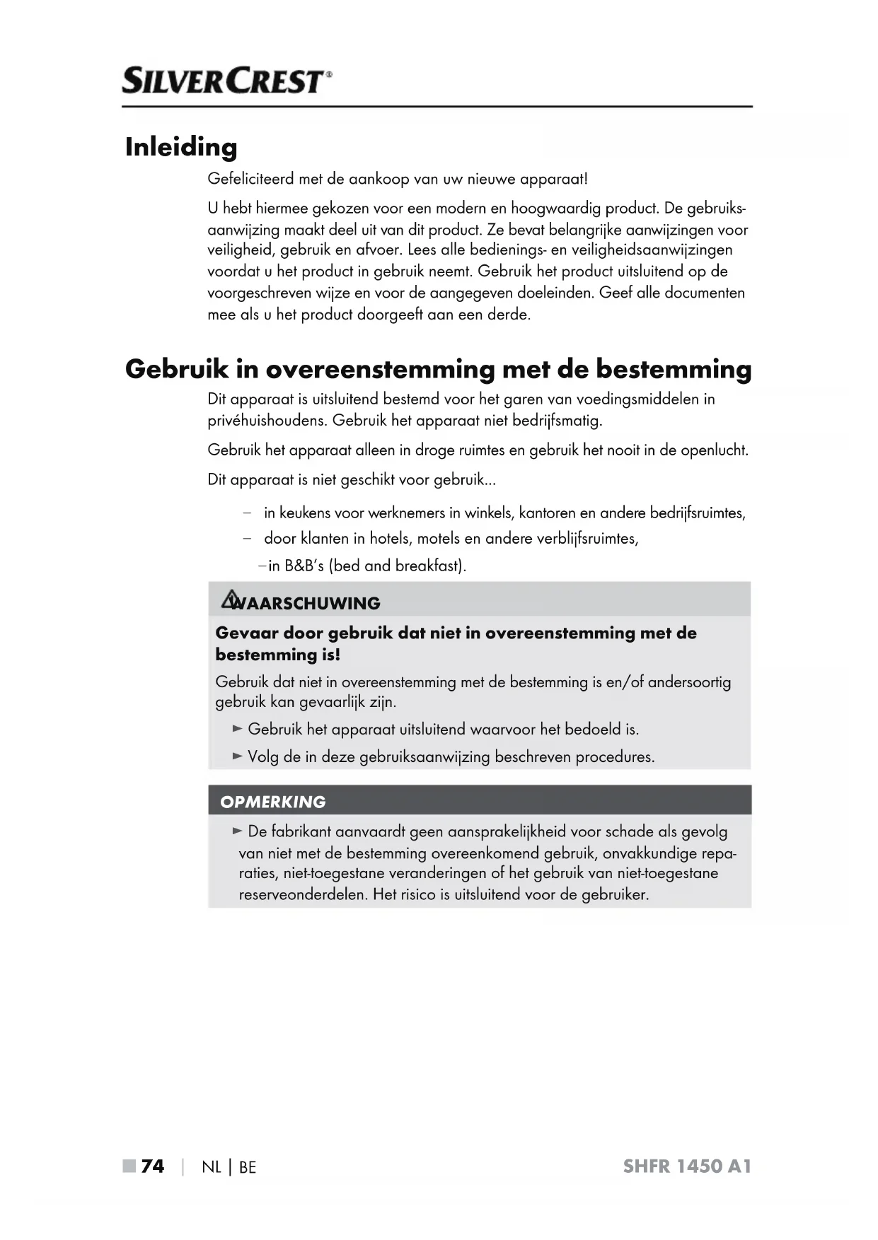 SHFR 1450 A1 Inleiding Gefeliciteerd met de aankoop van uw nieuwe apparaat! U hebt hiermee gekozen voor een modern en hoogwaardig product. De gebruiks- aanwijzing maakt deel uit van dit product. Ze bevat belangrijke aanwijzingen voor veiligheid, gebruik en afvoer. Lees alle bedienings- en veiligheidsaanwijzingen voordat u het product in gebruik neemt. Gebruik het product uitsluitend op de voorgeschreven wijze en voor de aangegeven doeleinden. Geef alle documenten mee als u het product doorgeeft aan een derde. Gebruik in overeenstemming met de bestemming Dit apparaat is uitsluitend bestemd voor het garen van voedingsmiddelen in privéhuishoudens. Gebruik het apparaat niet bedrijfsmatig. Gebruik het apparaat alleen in droge ruimtes en gebruik het nooit in de openlucht. Dit apparaat is niet geschikt voor gebruik... – in keukens voor werknemers in winkels, kantoren en andere bedrijfsruimtes, – door klanten in hotels, motels en andere verblijfsruimtes, – JO##TCFEBOECSFBLGBTU WAARSCHUWING Gevaar door gebruik dat niet in overeenstemming met de bestemming is! Gebruik dat niet in overeenstemming met de bestemming is en/of andersoortig gebruik kan gevaarlijk zijn. ► Gebruik het apparaat uitsluitend waarvoor het bedoeld is. ► Volg de in deze gebruiksaanwijzing beschreven procedures. OPMERKING ► De fabrikant aanvaardt geen aansprakelijkheid voor schade als gevolg van niet met de bestemming overeenkomend gebruik, onvakkundige repa- raties, niet-toegestane veranderingen of het gebruik van niet-toegestane reserveonderdelen. Het risico is uitsluitend voor de gebruiker.NL