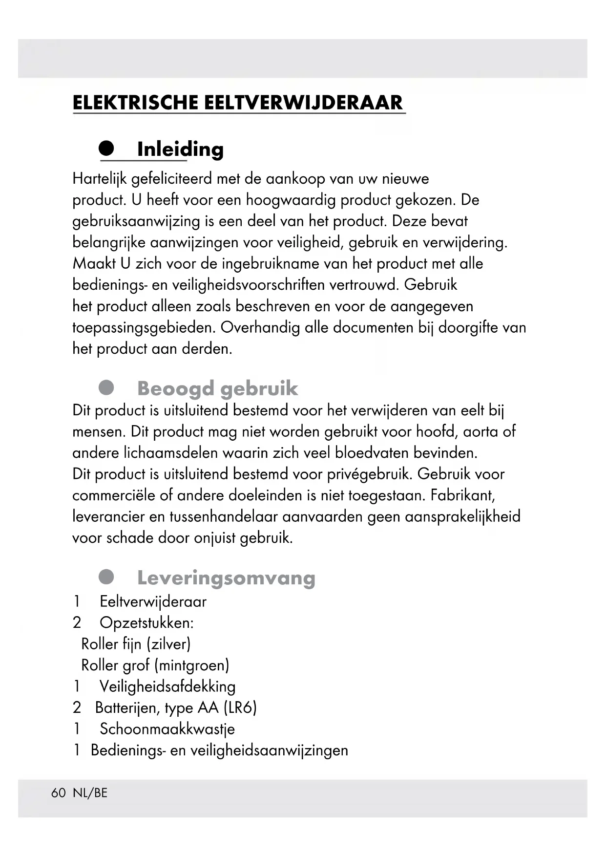 WAARSCHUWING! Bij langdurig gebruik wordt het product erg heet waardoor het brandwonden kan veroorzaken. Controleer daarom tijdens het gebruik regelmatig hoe warm het product is. In het bijzonder zijn diabetici minder gevoelig voor het optreden van verbrandingen. Wees uiterst voorzichtig. Wend u indien nodig tot een arts. m OPGELET! Het product is geen speelgoed! Kinderen onderschatten de gevaren van elektrische apparaten vaak. Dit product mag onder toezicht door kinderen vanaf 3 jaar worden gebruikt. Dit product kan door kinderen vanaf 8 jaar alsook door personen met een lichamelijke, sensorische of geestelijke handicap of een gebrek aan ervaring en/of kennis gebruikt worden, zolang ze onder toezicht staan of over veilig gebruik van het product zijn geïnstrueerd en de daaraan verbonden risico's begrijpen.63 NL/BE Laat kinderen niet met het product spelen. Schoonmaken en onderhoud mogen niet zonder toezicht door kinderen worden uitgevoerd. Gebruik het product niet als het beschadigd is. Anders kunnen er verwondingen optreden. Zorg ervoor dat er zich geen verontreinigingen in het product bevinden. Open het product alleen om de batterijen te vervangen. In het product bevinden zich geen onderdelen die door de gebruiker onderhouden moeten worden. Zet het product uit voordat u het schoon gaat maken. Stel het product om het niet te beschadigen niet bloot aan hoge temperaturen. Vermijd harde stoten of mechanische belasting om te voorkomen dat het product beschadigd wordt.64 NL/BE Wend u tot een expert voor reparaties, bij beschadiging en bij andere problemen met het product. Dompel het product niet onder in water. Gebruik het product niet in het bad, onder de douche, in zwembaden of in met water gevulde wastafels. Gebruik het product niet als u gewond bent of als de huid van uw handen of voeten beschadigd is. m OPGELET! Beweeg het product voorzichtig in cirkels en stop niet op een bepaalde plaats, om te voorkomen dat de temperatuur daar te hoog wordt. m OPGELET! Druk niet te hard op het product en beweeg het opzetstuk altijd voorzichtig over de plaatsen die behandeld moeten worden.65 NL/BE Zorg ervoor dat de roller altijd vrij kan draaien. De roller mag niet permanent geblokkeerd worden om te voorkomen dat hij te heet wordt en zo het product beschadigt. m OPGELET! Controleer tijdens het gebruik regelmatig hoe warm het product is. Als u een onaangename reactie van de huid constateert, stop dan met het gebruik van het product. Op hygiënische gronden mag het product slechts door een enkele persoon gebruikt worden. Laat het product niet vallen om schade aan de onderdelen binnenin te vermijden. Laat geen water in het binnenste van het product terechtkomen. Gebeurt dat toch, verwijder dan de batterijen en gebruik het product pas weer als het helemaal droog is.66 NL/BE Controleer het product voor ieder gebruik. Gebruik het product niet als de roller beschadigd is of niet goed lijkt te werken omdat er anders verwondingen kunnen ontstaan. Gebruik om verwondingen te vermijden alleen de met het product meegeleverde of online bestelde rollers. Bestelinformatie: Zie hoofdstuk "Accessoires bestellen". Gebruik het product alleen met droge handen. WAARSCHUWING! Bescherm het apparaat tegen vocht. Dompel het apparaat niet onder in water. WAARSCHUWING! Houd het product droog.67 NL/BE Veiligheidsaanwijzingen voor batterijen/ accu's LEVENSGEVAAR! Houd batterijen/ accu's buiten bereik van kinderen. Neem in geval van inslikken direct contact op met een arts!