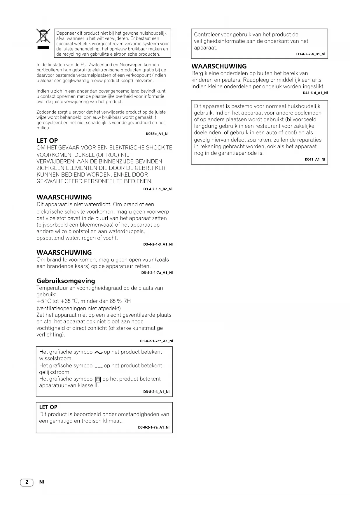 GEKWALIFICEERD PERSONEEL TE BEDIENEN. D3-4-2-1-1_B2_Nl WAARSCHUWING Dit apparaat is niet waterdicht. Om brand of een elektrische schok te voorkomen, mag u geen voorwerp dat vloeistof bevat in de buurt van het apparaat zetten (bijvoorbeeld een bloemenvaas) of het apparaat op andere wijze blootstellen aan waterdruppels, opspattend water, regen of vocht. D3-4-2-1-3_A1_Nl WAARSCHUWING Om brand te voorkomen, mag u geen open vuur (zoals een brandende kaars) op de apparatuur zetten. D3-4-2-1-7a_A1_Nl Gebruiksomgeving Temperatuur en vochtigheidsgraad op de plaats van gebruik: +5 °C tot +35 °C, minder dan 85 % RH (ventilatieopeningen niet afgedekt) Zet het apparaat niet op een slecht geventileerde plaats en stel het apparaat ook niet bloot aan hoge vochtigheid of direct zonlicht (of sterke kunstmatige verlichting). D3-4-2-1-7c*_A1_Nl Controleer voor gebruik van het product de veiligheidsinformatie aan de onderkant van het apparaat. D3-4-2-2-4_B1_Nl WAARSCHUWING Berg kleine onderdelen op buiten het bereik van kinderen en peuters. Raadpleeg onmiddellijk een arts indien kleine onderdelen per ongeluk worden ingeslikt. D41-6-4_A1_Nl Dit apparaat is bestemd voor normaal huishoudelijk gebruik. Indien het apparaat voor andere doeleinden of op andere plaatsen wordt gebruikt (bijvoorbeeld langdurig gebruik in een restaurant voor zakelijke doeleinden, of gebruik in een auto of boot) en als gevolg hiervan defect zou raken, zullen de reparaties in rekening gebracht worden, ook als het apparaat nog in de garantieperiode is. K041_A1_Nl Het grafische symbool op het product betekent wisselstroom. Het grafische symbool op het product betekent gelijkstroom. Het grafische symbool op het product betekent apparatuur van klasse II. D3-8-2-4_A1_Nl LET OP Dit product is beoordeeld onder omstandigheden van een gematigd en tropisch klimaat. D3-8-2-1-7a_A1_Nl3