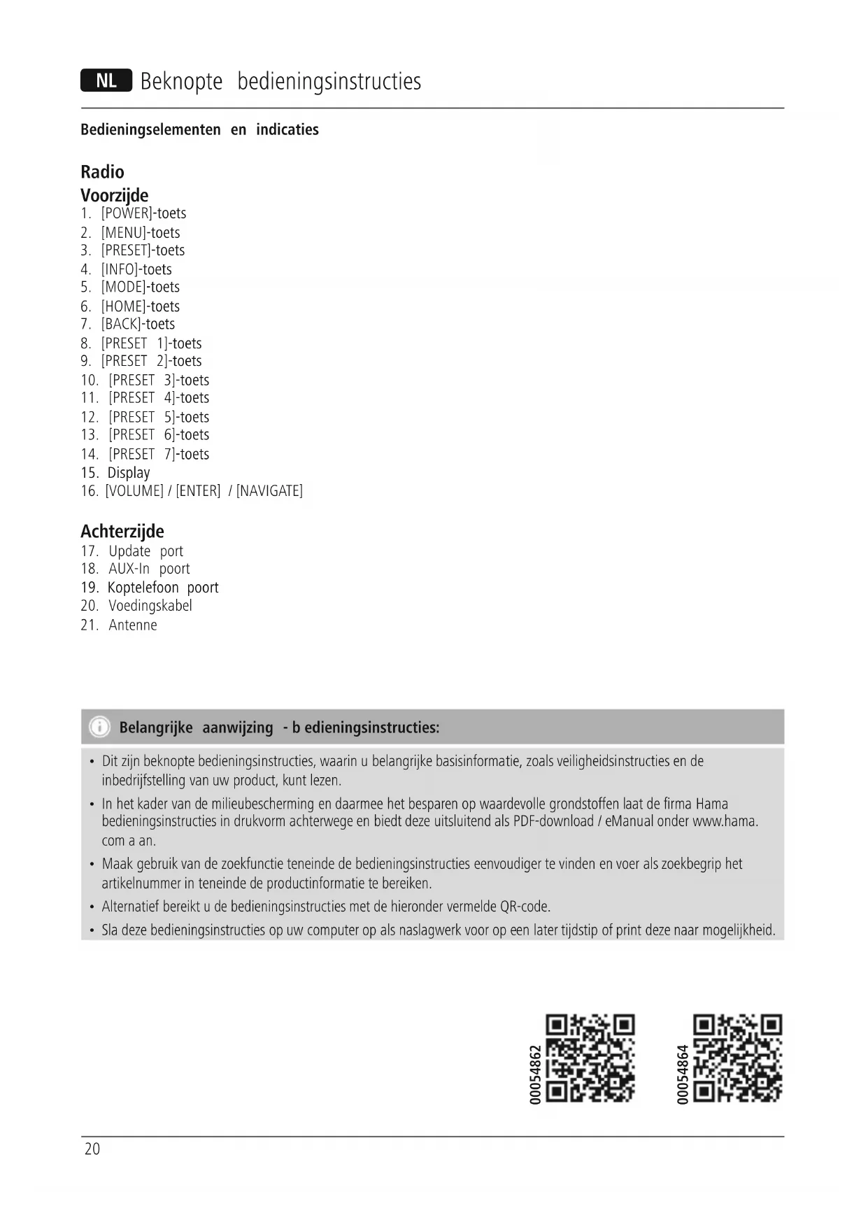 Downloads.20 N Beknopte bedieningsinstructies Bedieningselementen en indicaties Radio Voorzijde