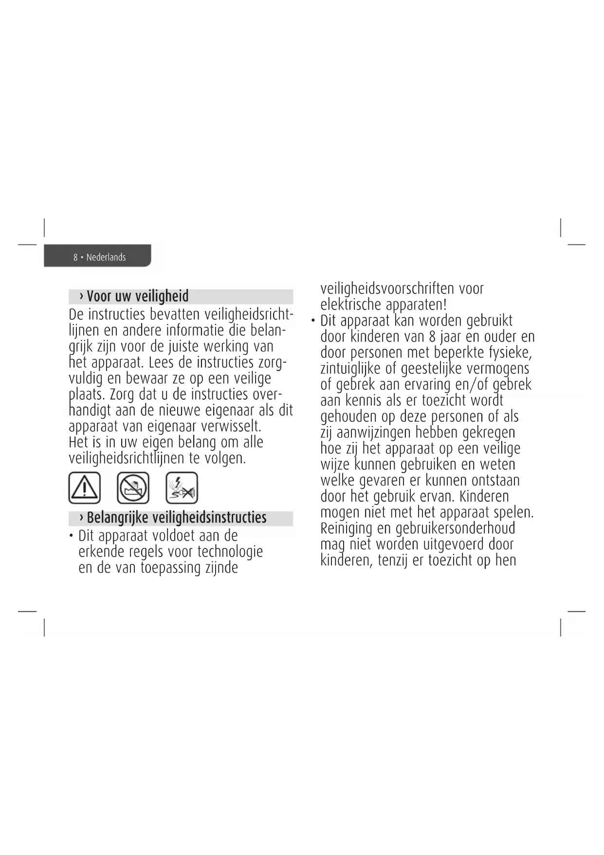 - Dit apparaat kan worden gebruikt door kinderen van 8aar en ouder en door Personen met beperkke fysieke, zintuiglijke of geestelijkke vermogens of gebrek aan ervaring en/of gebrek aan kennis als er toezicht worden gehonden op deze Personen of als zij aanwijzingen hebben gekreten hoe zij het apparaat op een veilige wijze kunnen gebruiken en weten welke bevaren er kunnen ontstaandoor het gebruik ervan. Kinderen mogen Niet met het apparaat spelen. Reiniging en gebruikersondoud mag nicht worden uitgevoerd door kinderen, tenzij er toezicht op hen