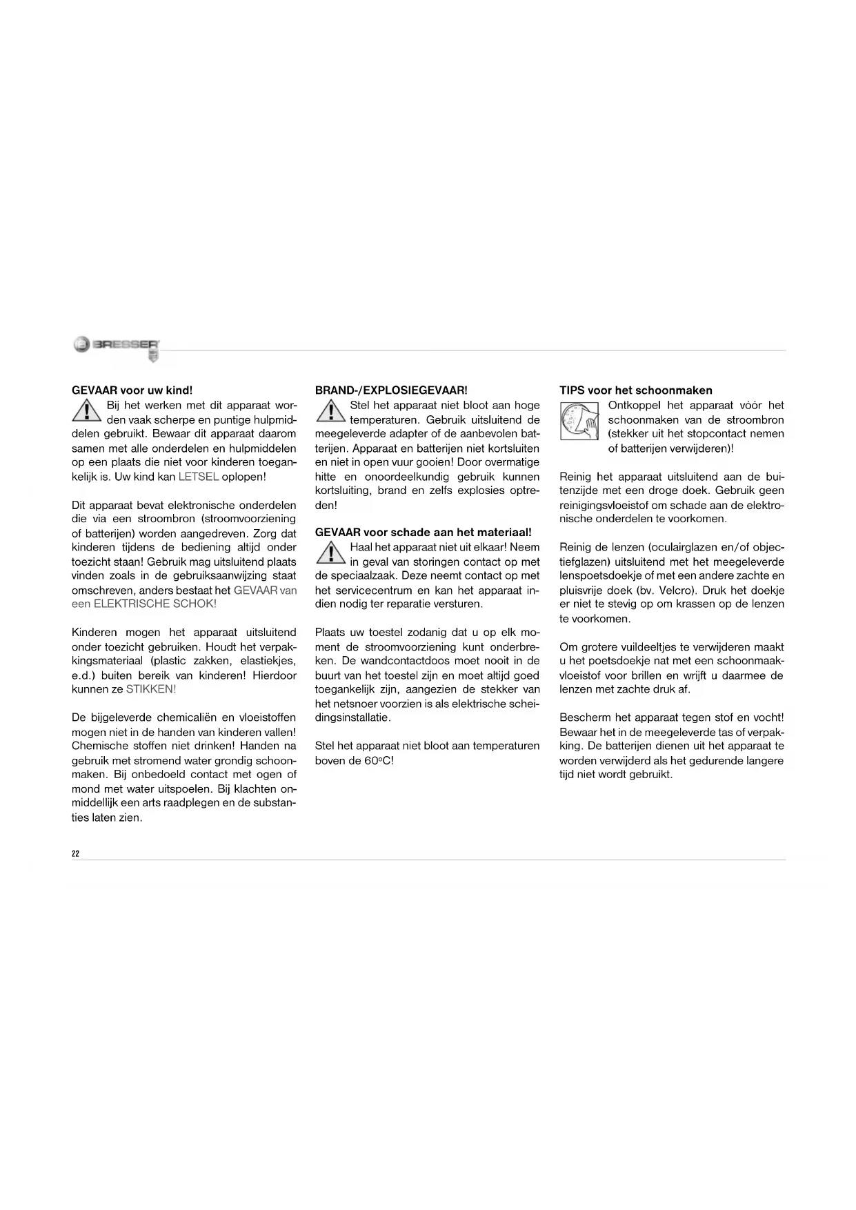 - si besoin, diminuer la résolution de la carte graphique Pour pouvoir profi ter longtemps de ton microscope... Nettoie les lentilles (oculaires et/ou objectifs) uniquement avec le chiffon à lentilles ci-joint ou bien avec un autre chiffon doux et non pelucheux (par exemple en microfi bre). N’ap- puie pas le chiffon trop fort sur les lentilles, car elles sont très fragiles et tu risquerais de les rayer ! Si ton microscope est très sale, demande à tes parents de t’aider à les nettoyer. Deman- de-leur d’humidifi er le chiffon avec un peu de liquide de nettoyage et de nettoyer les len- tilles en appuyant très peu. Veille à toujours tenir ton microscope à l’abri de la poussière et de l’humidité ! Après l’avoir utilisé, le quelque temps chez toi à tempé- rature ambiante afi n que le reste d’humidité puisse s’évaporer. Conserve ton microscope dans la pochette que tu as reçue à la livrai- son.22 GEVAAR voor uw kind! Bij het werken met dit apparaat wor- den vaak scherpe en puntige hulpmid- delen gebruikt. Bewaar dit apparaat daarom samen met alle onderdelen en hulpmiddelen op een plaats die niet voor kinderen toegan- kelijk is. Uw kind kan LETSEL oplopen! Dit apparaat bevat elektronische onderdelen die via een stroombron (stroomvoorziening of batterijen) worden aangedreven. Zorg dat kinderen tijdens de bediening altijd onder toezicht staan! Gebruik mag uitsluitend plaats vinden zoals in de gebruiksaanwijzing staat omschreven, anders bestaat het GEVAAR van een ELEKTRISCHE SCHOK! Kinderen mogen het apparaat uitsluitend onder toezicht gebruiken. Houdt het verpak- kingsmateriaal (plastic zakken, elastiekjes, e.d.) buiten bereik van kinderen! Hierdoor kunnen ze STIKKEN! De bijgeleverde chemicaliën en vloeistoffen mogen niet in de handen van kinderen vallen! Chemische stoffen niet drinken! Handen na gebruik met stromend water grondig schoon- maken. Bij onbedoeld contact met ogen of mond met water uitspoelen. Bij klachten on- middellijk een arts raadplegen en de substan- ties laten zien. BRAND-/EXPLOSIEGEVAAR! Stel het apparaat niet bloot aan hoge temperaturen. Gebruik uitsluitend de meegeleverde adapter of de aanbevolen bat- terijen. Apparaat en batterijen niet kortsluiten en niet in open vuur gooien! Door overmatige hitte en onoordeelkundig gebruik kunnen kortsluiting, brand en zelfs explosies optre- den! GEVAAR voor schade aan het materiaal! Haal het apparaat niet uit elkaar! Neem in geval van storingen contact op met de speciaalzaak. Deze neemt contact op met het servicecentrum en kan het apparaat in- dien nodig ter reparatie versturen. Plaats uw toestel zodanig dat u op elk mo- ment de stroomvoorziening kunt onderbre- ken. De wandcontactdoos moet nooit in de buurt van het toestel zijn en moet altijd goed toegankelijk zijn, aangezien de stekker van het netsnoer voorzien is als elektrische schei- dingsinstallatie. Stel het apparaat niet bloot aan temperaturen boven de 60ºC! TIPS voor het schoonmaken Ontkoppel het apparaat vóór het schoonmaken van de stroombron (stekker uit het stopcontact nemen of batterijen verwijderen)! Reinig het apparaat uitsluitend aan de bui- tenzijde met een droge doek. Gebruik geen reinigingsvloeistof om schade aan de elektro- nische onderdelen te voorkomen. Reinig de lenzen (oculairglazen en/of objec- tiefglazen) uitsluitend met het meegeleverde lenspoetsdoekje of met een andere zachte en pluisvrije doek (bv. Velcro). Druk het doekje er niet te stevig op om krassen op de lenzen te voorkomen. Om grotere vuildeeltjes te verwijderen maakt u het poetsdoekje nat met een schoonmaak- vloeistof voor brillen en wrijft u daarmee de lenzen met zachte druk af. Bescherm het apparaat tegen stof en vocht! Bewaar het in de meegeleverde tas of verpak- king. De batterijen dienen uit het apparaat te worden verwijderd als het gedurende langere tijd niet wordt gebruikt.23