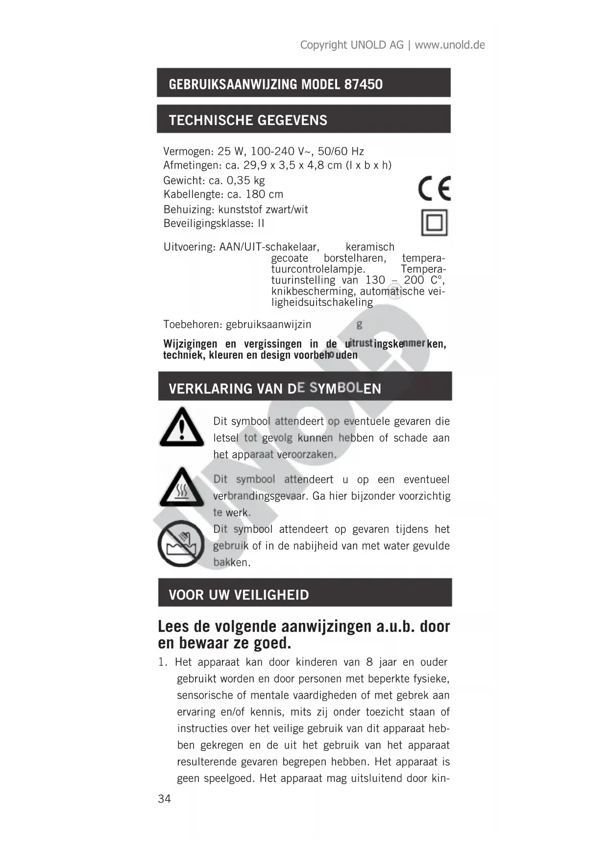 gebruikt worden en door personen met beperkte fysieke, sensorische of mentale vaardigheden of met gebrek aan ervaring en/of kennis, mits zij onder toezicht staan of instructies over het veilige gebruik van dit apparaat heb- ben gekregen en de uit het gebruik van het apparaat resulterende gevaren begrepen hebben. Het apparaat is geen speelgoed. Het apparaat mag uitsluitend door kin- Dit symbool attendeert op eventuele gevaren die letsel tot gevolg kunnen hebben of schade aan het apparaat veroorzaken. Dit symbool attendeert u op een eventueel verbrandingsgevaar. Ga hier bijzonder voorzichtig te werk. Dit symbool attendeert op gevaren tijdens het gebruik of in de nabijheid van met water gevulde bakken. Copyright UNOLD AG | www.unold.de35 deren gereinigd en onderhouden worden, indien deze onder toezicht staan.