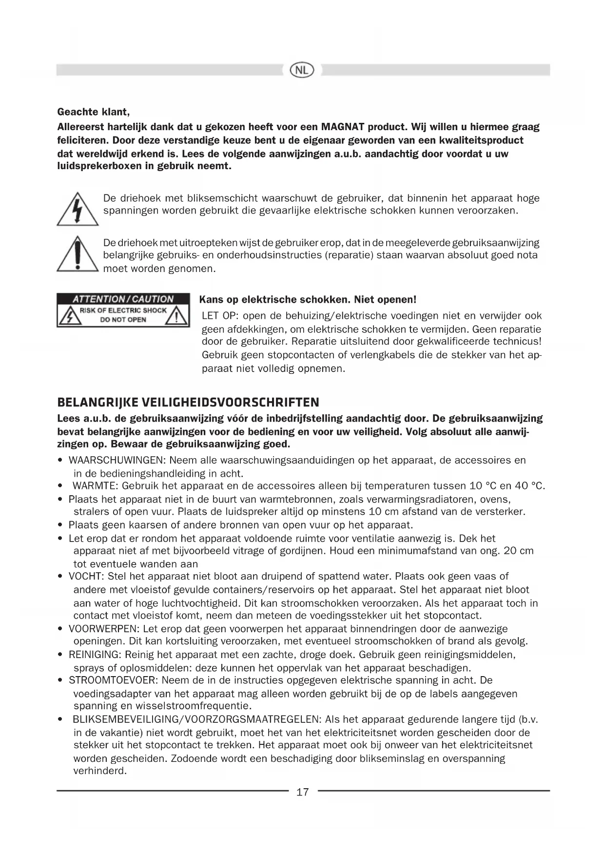 - Mise au rebut de la pile: Les piles usagées sont des déchets dangereux et doivent être mises au rebut conformément aux réglementations en vigueur. Power (12) Permet d‘allumer l‘appareil lorsque celui-ci se trouve en mode de veille. Si la LED ne s‘allume pas, mettez en marche l‘appareil à l‘aide de l‘interrupteur d‘alimentation situé sur la face arrière de l‘appareil. À l‘inverse, ce bouton permet de mettre en veille l‘appareil lorsque celui-ci est en marche.16 Volume (13) Augmente ( ) ou réduit ( ) le volume sonore. ENTRETIEN Veuillez employer un chiffon sec et doux et évitez d’appliquer tout produit de nettoyage, spray ou solvant chimique afin de ne pas endommager la surface de l’appareil. SPECIFICATIONS TECHNIQUES Configuration: Subwoofer actif bass reflex, configuration Downfire Equipement: pilote d’élévation longue 38 cm Puissance de sortie RMS/Max.: 150 / 300 Watt Bande passante: 17 – 200 Hz Fréquence séparatrice: 50 – 150 Hz réglable Dimensions (LxHxP): 458 x 545 x 620 mm Accessoires: câble secteur Sous toutes réserves de modications techniques.17 Geachte klant, Allereerst hartelijk dank dat u gekozen heeft voor een MAGNAT product. Wij willen u hiermee graag feliciteren. Door deze verstandige keuze bent u de eigenaar geworden van een kwaliteitsproduct dat wereldwijd erkend is. Lees de volgende aanwijzingen a.u.b. aandachtig door voordat u uw luidsprekerboxen in gebruik neemt. De driehoek met bliksemschicht waarschuwt de gebruiker, dat binnenin het apparaat hoge spanningen worden gebruikt die gevaarlijke elektrische schokken kunnen veroorzaken. De driehoek met uitroepteken wijst de gebruiker erop, dat in de meegeleverde gebruiksaanwijzing belangrijke gebruiks- en onderhoudsinstructies (reparatie) staan waarvan absoluut goed nota moet worden genomen. Kans op elektrische schokken. Niet openen! LET OP: open de behuizing/elektrische voedingen niet en verwijder ook geen afdekkingen, om elektrische schokken te vermijden. Geen reparatie door de gebruiker. Reparatie uitsluitend door gekwalificeerde technicus! Gebruik geen stopcontacten of verlengkabels die de stekker van het ap- paraat niet volledig opnemen. BELANGRIJKE VEILIGHEIDSVOORSCHRIFTEN Lees a.u.b. de gebruiksaanwijzing vóór de inbedrijfstelling aandachtig door. De gebruiksaanwijzing bevat belangrijke aanwijzingen voor de bediening en voor uw veiligheid. Volg absoluut alle aanwij- zingen op. Bewaar de gebruiksaanwijzing goed.