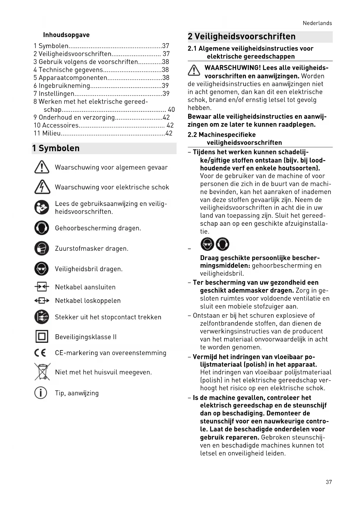 veiligheidsvoorschriften – Tijdens het werken kunnen schadelij ke/giftige stoffen ontstaan (bijv. bij lood houdende verf en enkele houtsoorten). Voor de gebruiker van de machine of voor personen die zich in de buurt van de machi ne bevinden, kan het aanraken of inademen van deze stoffen gevaarlijk zijn. Neem de veiligheidsvoorschriften in acht die in uw land van toepassing zijn. Sluit het gereed schap aan op een geschikte afzuiginstalla tie.