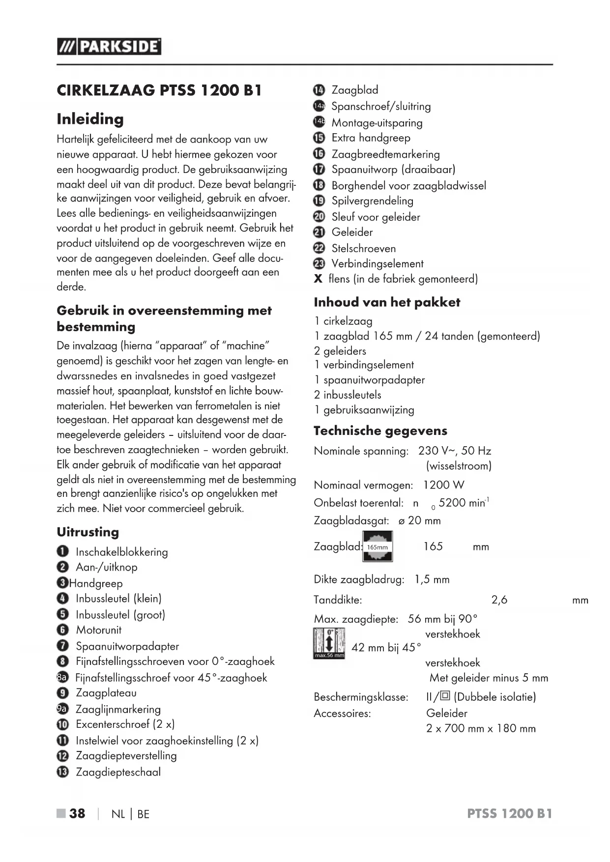 Zaaglijnmarkering Excenterschroef (2 x) Instelwiel voor zaaghoekinstelling (2 x) Zaagdiepteverstelling Zaagdiepteschaal Zaagblad 14a Spanschroef/sluitring 14b Montage-uitsparing Extra handgreep Zaagbreedtemarkering Spaanuitworp (draaibaar) Borghendel voor zaagbladwissel Spilvergrendeling Sleuf voor geleider Geleider Stelschroeven Verbindingselement X flens (in de fabriek gemonteerd) Inhoud van het pakket 1 cirkelzaag 1 zaagblad 165 mm / 24 tanden (gemonteerd) 2 geleiders 1 verbindingselement 1 spaanuitworpadapter 2 inbussleutels 1 gebruiksaanwijzing Technische gegevens Nominale spanning: 230 V∼, 50 Hz (wisselstroom) Nominaal vermogen: 1200 W Onbelast toerental: n