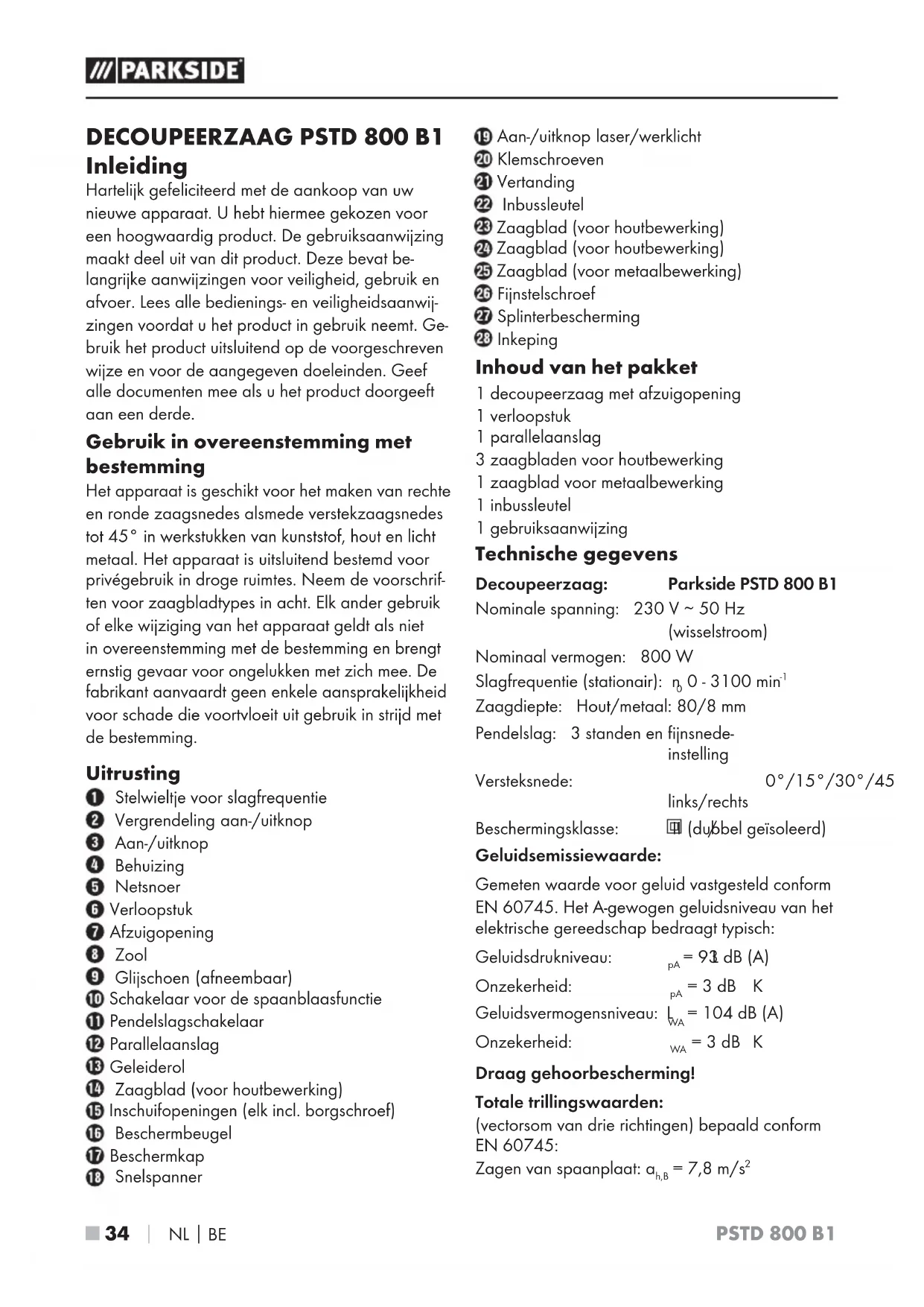 Inleiding Hartelijk gefeliciteerd met de aankoop van uw nieuwe apparaat. U hebt hiermee gekozen voor een hoogwaardig product. De gebruiksaanwijzing maakt deel uit van dit product. Deze bevat be- langrijke aanwijzingen voor veiligheid, gebruik en afvoer. Lees alle bedienings- en veiligheidsaanwij- zingen voordat u het product in gebruik neemt. Ge- bruik het product uitsluitend op de voorgeschreven wijze en voor de aangegeven doeleinden. Geef alle documenten mee als u het product doorgeeft aan een derde. Gebruik in overeenstemming met bestemming Het apparaat is geschikt voor het maken van rechte en ronde zaagsnedes alsmede verstekzaagsnedes tot 45° in werkstukken van kunststof, hout en licht metaal. Het apparaat is uitsluitend bestemd voor privégebruik in droge ruimtes. Neem de voorschrif- ten voor zaagbladtypes in acht. Elk ander gebruik of elke wijziging van het apparaat geldt als niet in overeenstemming met de bestemming en brengt ernstig gevaar voor ongelukken met zich mee. De fabrikant aanvaardt geen enkele aansprakelijkheid voor schade die voortvloeit uit gebruik in strijd met de bestemming. Uitrusting Stelwieltje voor slagfrequentie Vergrendeling aan-/uitknop Aan-/uitknop Behuizing Netsnoer Verloopstuk Afzuigopening Zool Glijschoen (afneembaar) Schakelaar voor de spaanblaasfunctie Pendelslagschakelaar Parallelaanslag Geleiderol Zaagblad (voor houtbewerking) Inschuifopeningen (elk incl. borgschroef) Beschermbeugel Beschermkap Snelspanner Aan-/uitknop laser/werklicht Klemschroeven Vertanding Inbussleutel Zaagblad (voor houtbewerking) Zaagblad (voor houtbewerking) Zaagblad (voor metaalbewerking) Fijnstelschroef Splinterbescherming Inkeping Inhoud van het pakket 1 decoupeerzaag met afzuigopening 1 verloopstuk 1 parallelaanslag 3 zaagbladen voor houtbewerking 1 zaagblad voor metaalbewerking 1 inbussleutel 1 gebruiksaanwijzing Technische gegevens Decoupeerzaag: Parkside PSTD 800 B1 Nominale spanning: 230 V ∼ 50 Hz (wisselstroom) Nominaal vermogen: 800 W Slagfrequentie (stationair): n