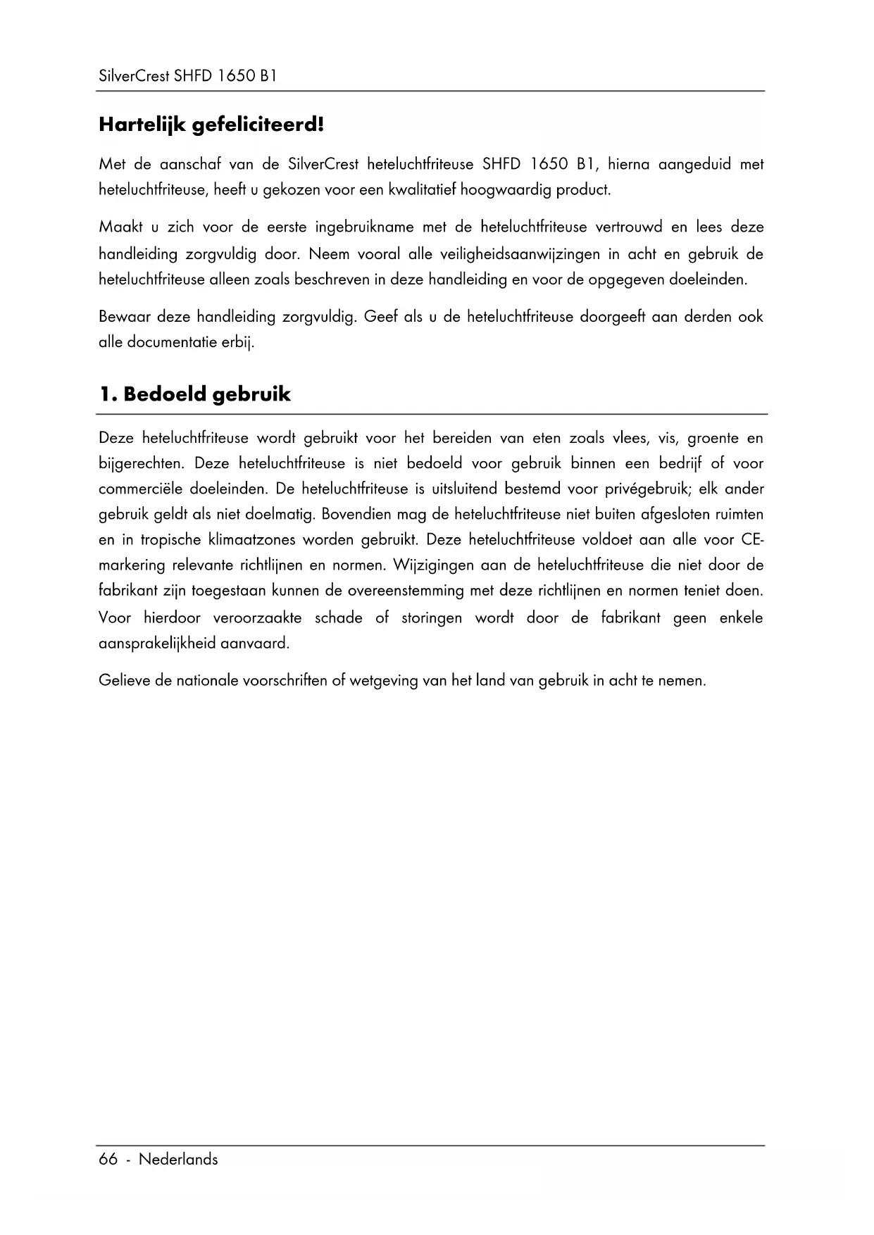 Hartelijk gefeliciteerd! Met de aanschaf van de SilverCrest heteluchtfriteuse SHFD 1650 B1, hierna aangeduid met heteluchtfriteuse, heeft u gekozen voor een kwalitatief hoogwaardig product. Maakt u zich voor de eerste ingebruikname met de heteluchtfriteuse vertrouwd en lees deze handleiding zorgvuldig door. Neem vooral alle veiligheidsaanwijzingen in acht en gebruik de heteluchtfriteuse alleen zoals beschreven in deze handleiding en voor de opgegeven doeleinden. Bewaar deze handleiding zorgvuldig. Geef als u de heteluchtfriteuse doorgeeft aan derden ook alle documentatie erbij.
