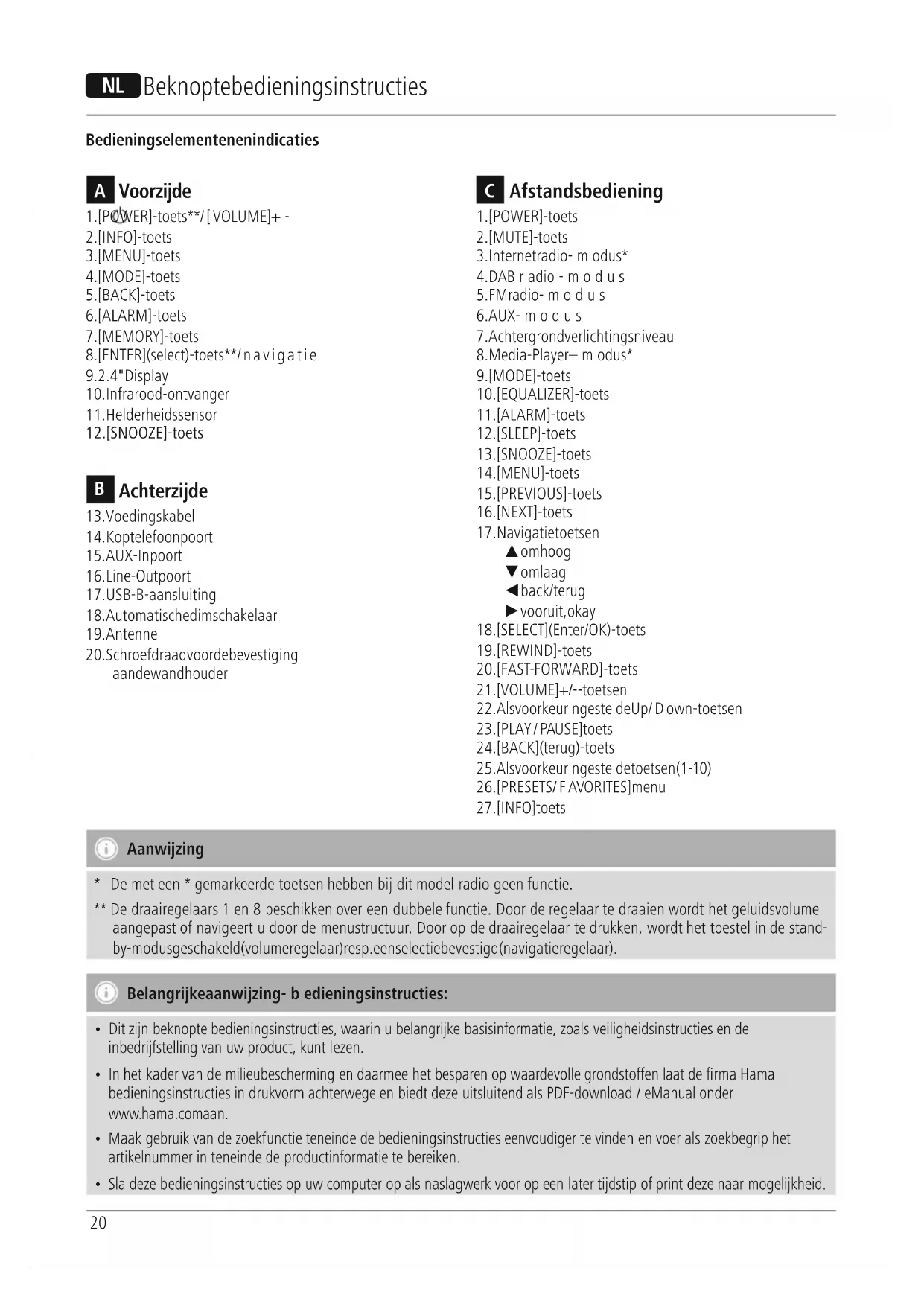 aan de wandhouder Aanwijzing *Demet een *gemarkeerde toetsen hebben bij dit model radio geen functie. ** De draairegelaars 1en8beschikken over een dubbele functie. Door de regelaar te draaien wordt het geluidsvolume aangepast of navigeert udoor de menustructuur.Door op de draairegelaar te drukken, wordt het toestel in de stand- by-modus geschakeld (volumeregelaar) resp. een selectie bevestigd (navigatieregelaar). Belangrijke aanwijzing -bedieningsinstructies: