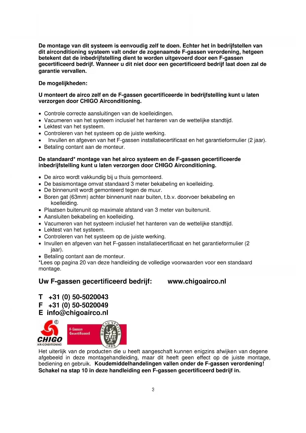 - Betaling contant aan de monteur. *Lees op pagina 20 van deze handleiding de volledige voorwaarden voor een standaard montage. Uw F-gassen gecertificeerd bedrijf: www.chigoairco.nl