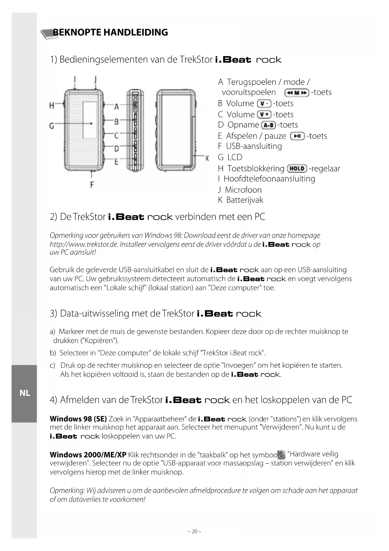 Windows 98 (SE) Zoek in "Apparaatbeheer" de i.Beat rock (onder "stations") en klik vervolgens met de linker muisknop het apparaat aan. Selecteer het menupunt "Verwijderen". Nu kunt u de i.Beat rock loskoppelen van uw PC. Windows 2000/ME/XP Klik rechtsonder in de "taakbalk" op het symbool "Hardware veilig verwijderen". Selecteer nu de optie "USB-apparaat voor massaopslag – station verwijderen" en klik vervolgens hierop met de linker muisknop. Opmerking: Wij adviseren u om de aanbevolen afmeldprocedure te volgen om schade aan het apparaat of om dataverlies te voorkomen! A Terugspoelen / mode / vooruitspoelen -toets B Volume -toets C Volume -toets D Opname -toets E Afspelen / pauze -toets F USB-aansluiting G LCD H Toetsblokkering -regelaar I Hoofdtelefoonaansluiting J Microfoon K Batterijvak– 20 –