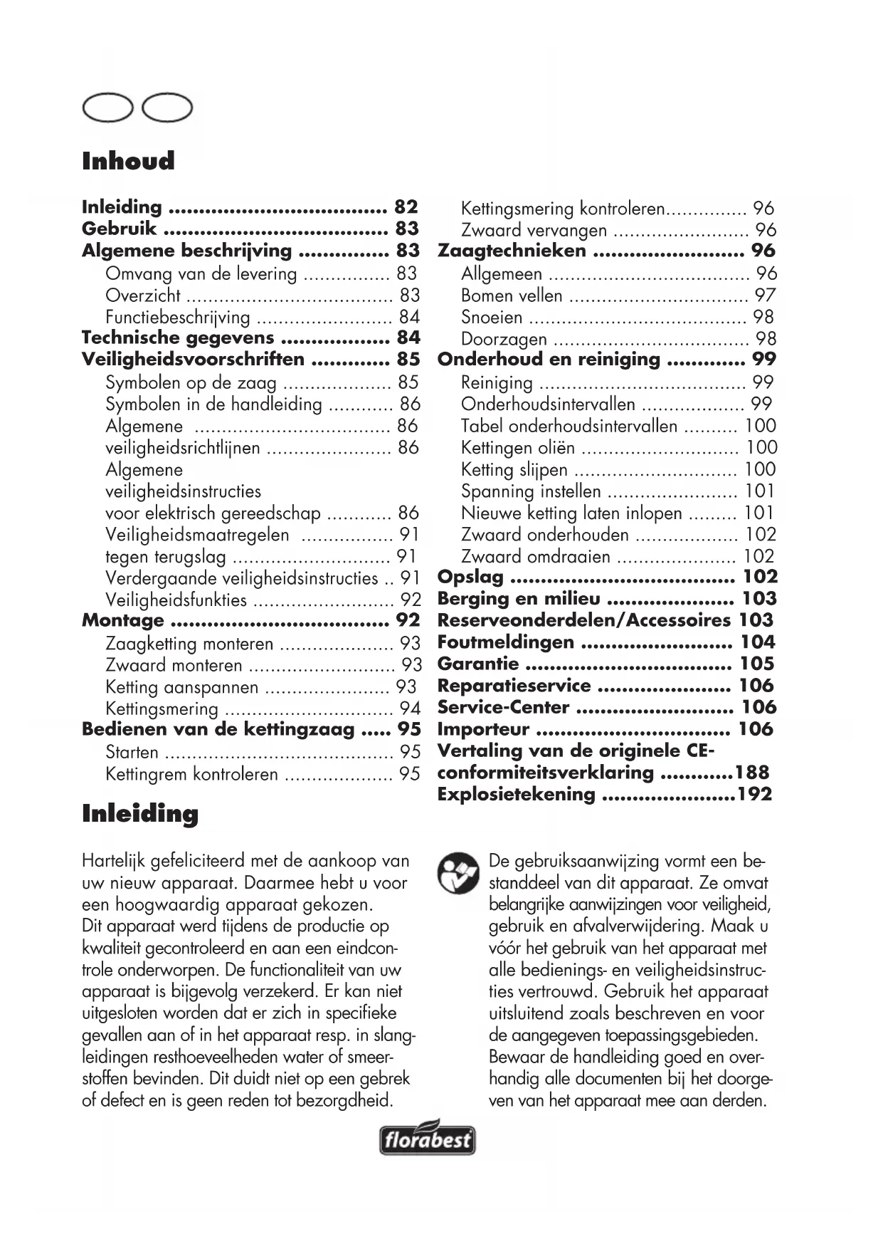 Gegarandeerd akoestisch niveau Pictogram op de typeplaat: Machines horen niet b huishoude- lk afval thuis. 460 mm Zwaardlengte Veiligheidsklasse II Pictogram onder de kettingwielafdekking: Looprichting van de zaagketting in acht ne- men. Let op! Lees de gebruiksaanwijzing. tdens dewelke het elektrische gereedschap uitgeschakeld is, en tden, tdens dewelke het welis- waar ingeschakeld is, maar zonder belasting functioneert). Veiligheidsvoorschriften Dit gedeelte behandelt de fundamentele veiligheidsrichtlnen b het werken met de elektrische kettingzaag. Een elektrische kettingzaag is een gevaarlke machine, die b fout of slordig gebruik ernstige of zelfs dode- lke verwondingen kan veroorzaken. Let daarom op volgende richtlnen voor zowel uw veiligheid als voor die van anderen en vraag b onzekerhe- den een vakman om raad. Symbolen op de zaag Maakt u zich vooraleer u met de elektronische kettingzaag gaat wer- ken met alle onderdelen vertrouwd. Oefen het hanteren van de zaag en vraag uitleg aan een vakman i.v.m.het functioneren, werkwze en zaagtechnieken. De motor kan niet starten als de ket- tingrem vergrendeld is. Ontgrendel de kettingrem door de remhendel tegen het voorste handvat te du- wen. Lees aandachtig de gebruiksaanw- zing die b de machine hoort! Oog- en oorbescherming dragen! Draag een veiligheidsbril!8 6 N L B E Pictogram op het zwaard: Looprichting van de zaagketting Pictogram op de olietankdop: Zaagketting oliën Pictogram op de bevestigingsschroef voor de kettingwielafdekking: OPEN DICHT Pictogram op de kettingremhendel: O Kettingrem: UIT I Kettingrem: AAN Symbolen in de handleiding Gevaarsymbolen met gege- vens ter preventie van licha- melke letsels en materiële schade. Gebodsteken (in plaats van het uitroepingsteken is het gebod toe- gelicht) met gegevens ter preventie van beschadigingen. Aanwzingsteken met informatie voor een betere omgang met het apparaat. Algemene veiligheidsrichtlnen Maakt u zich vooraleer u met de elektronische kettingzaag gaat wer- ken met alle onderdelen vertrouwd. Oefen het hanteren van de zaag (doorzagen van rond hout op een zaagbok) en vraag uitleg aan een ervaren gebruiker of een vakman i.v.m.het functioneren, werkwze en zaagtechnieken. Houd rekening met de geluidshinder en de lokale voorschriften b het vellen en zagen van bomen. Lokale voorschriften kunnen een controle op geschiktheid vereisen. Vraag dit na b de bevoegde instantie. Let op! B gebruik van elektrische gereedschappen dienen ter be- scherming tegen een elektrische schok, lichamelk letsel en brandge- vaar de volgende principiële veilig- heidsmaatregelen in acht te worden genomen. Er bestaat een risico op lichamelk letsel. Algemene veiligheidsinstructies voor elektrisch gereedschap WAARSCHUWING! Lees alle veiligheidsinstructies en aan- wzingen. Verzuim b de nale- ving van de veiligheidsinstructies en aanwzingen kan een elektrische schok, brand en/of ernstige ver- wondingen veroorzaken. Bewaar alle veiligheidsinstructies en aanwijzing voor de toekomst. Het in de veiligheidsinstructies gebruikte begrip „Elektrisch gereedschap“ heeft betrekking op elektrisch gereedschap met netvoeding (met netsnoer) en op elektrisch gereedschap met battervoeding (zonder netsnoer).8 7 B EN L Veiligheid op de werkplaats: