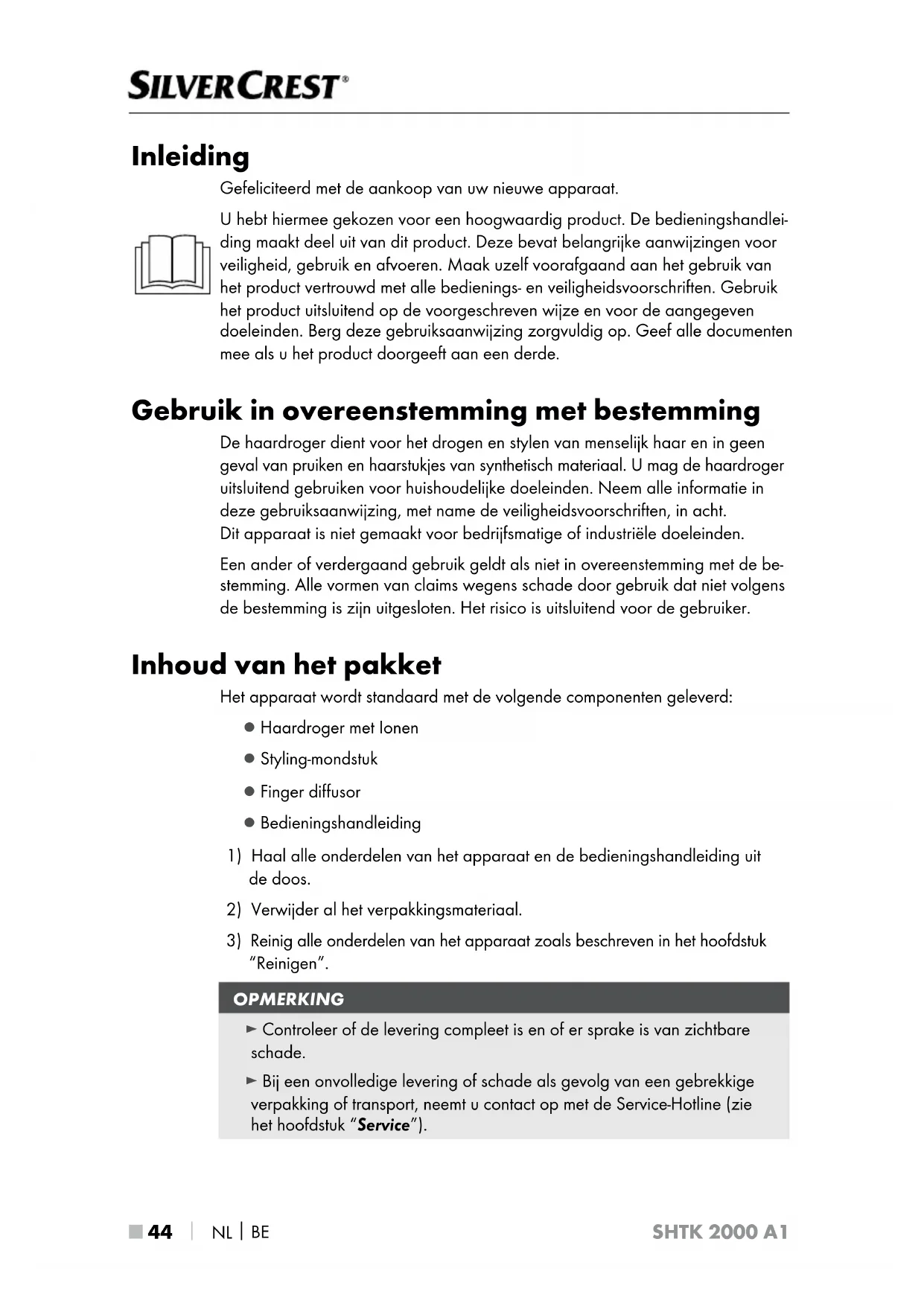 SHTK 2000 A1 Inleiding Gefeliciteerd met de aankoop van uw nieuwe apparaat. U hebt hiermee gekozen voor een hoogwaardig product. De bedieningshandlei- ding maakt deel uit van dit product. Deze bevat belangrijke aanwijzingen voor veiligheid, gebruik en afvoeren. Maak uzelf voorafgaand aan het gebruik van het product vertrouwd met alle bedienings- en veiligheidsvoorschriften. Gebruik het product uitsluitend op de voorgeschreven wijze en voor de aangegeven doeleinden. Berg deze gebruiksaanwijzing zorgvuldig op. Geef alle documenten mee als u het product doorgeeft aan een derde. Gebruik in overeenstemming met bestemming De haardroger dient voor het drogen en stylen van menselijk haar en in geen geval van pruiken en haarstukjes van synthetisch materiaal. U mag de haardroger uitsluitend gebruiken voor huishoudelijke doeleinden. Neem alle informatie in deze gebruiksaanwijzing, met name de veiligheidsvoorschriften, in acht. Dit apparaat is niet gemaakt voor bedrijfsmatige of industriële doeleinden. Een ander of verdergaand gebruik geldt als niet in overeenstemming met de be- stemming. Alle vormen van claims wegens schade door gebruik dat niet volgens de bestemming is zijn uitgesloten. Het risico is uitsluitend voor de gebruiker. Inhoud van het pakket Het apparaat wordt standaard met de volgende componenten geleverd: ▯ Haardroger met Ionen ▯ Styling-mondstuk ▯ Finger diffusor ▯ Bedieningshandleiding