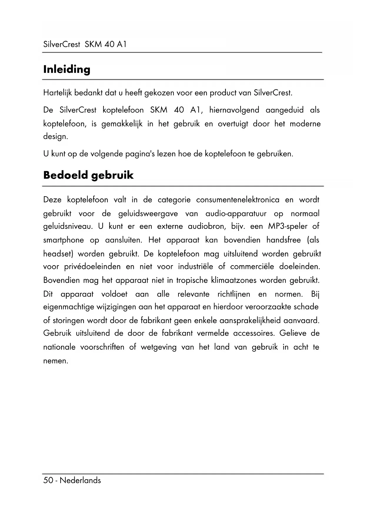 Inleiding Hartelijk bedankt dat u heeft gekozen voor een product van SilverCrest. De SilverCrest koptelefoon SKM 40 A1, hiernavolgend aangeduid als koptelefoon, is gemakkelijk in het gebruik en overtuigt door het moderne design. U kunt op de volgende pagina's lezen hoe de koptelefoon te gebruiken. Bedoeld gebruik Deze koptelefoon valt in de categorie consumentenelektronica en wordt gebruikt voor de geluidsweergave van audio-apparatuur op normaal geluidsniveau. U kunt er een externe audiobron, bijv. een MP3-speler of smartphone op aansluiten. Het apparaat kan bovendien handsfree (als headset) worden gebruikt. De koptelefoon mag uitsluitend worden gebruikt voor privédoeleinden en niet voor industriële of commerciële doeleinden. Bovendien mag het apparaat niet in tropische klimaatzones worden gebruikt. Dit apparaat voldoet aan alle relevante richtlijnen en normen. Bij eigenmachtige wijzigingen aan het apparaat en hierdoor veroorzaakte schade of storingen wordt door de fabrikant geen enkele aansprakelijkheid aanvaard. Gebruik uitsluitend de door de fabrikant vermelde accessoires. Gelieve de nationale voorschriften of wetgeving van het land van gebruik in acht te nemen.SilverCrest SKM 40 A1 Nederlands - 51 Leveringsomvang Neem het apparaat en alle accessoires uit de verpakking. Verwijder al het verpakkingsmateriaal en controleer of alle delen compleet en onbeschadigd zijn. Gelieve in het geval van een incomplete of beschadigde levering contact op te nemen met de fabrikant. A SilverCrest koptelefoon SKM 40 A1 B Audiokabel met 3,5mm jackplugs (met geïntegreerde microfoon en drukknop) C Deze bedieningshandleiding (symbool)SilverCrest SKM 40 A1