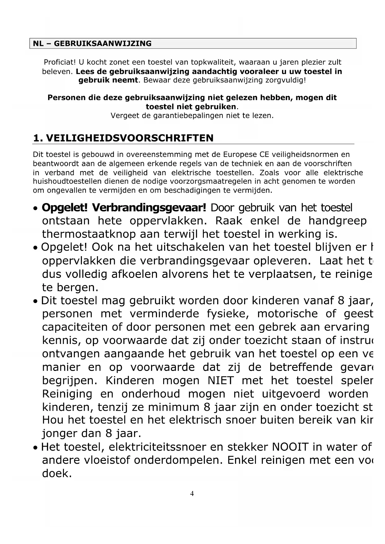 Dit toestel is gebouwd in overeenstemming met de Europese CE veiligheidsnormen en beantwoordt aan de algemeen erkende regels van de techniek en aan de voorschriften in verband met de veiligheid van elektrische toestellen. Zoals voor alle elektrische huishoudtoestellen dienen de nodige voorzorgsmaatregelen in acht genomen te worden om ongevalten te vermijden en om beschadigingen te vermijden.