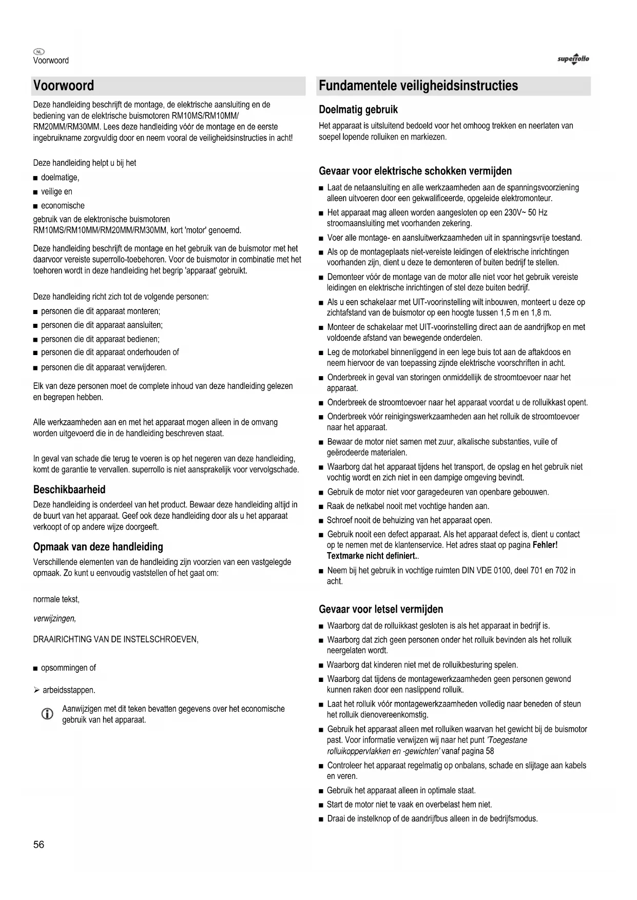 - Gebruik alleen originele reserveonderdelen en toebehoren van superrollo. Voor informatatie verwijzen wij hier het hoofdstuk 'Toebehoren' vanaf pagina Fehler! Textmarke nicht definiert.