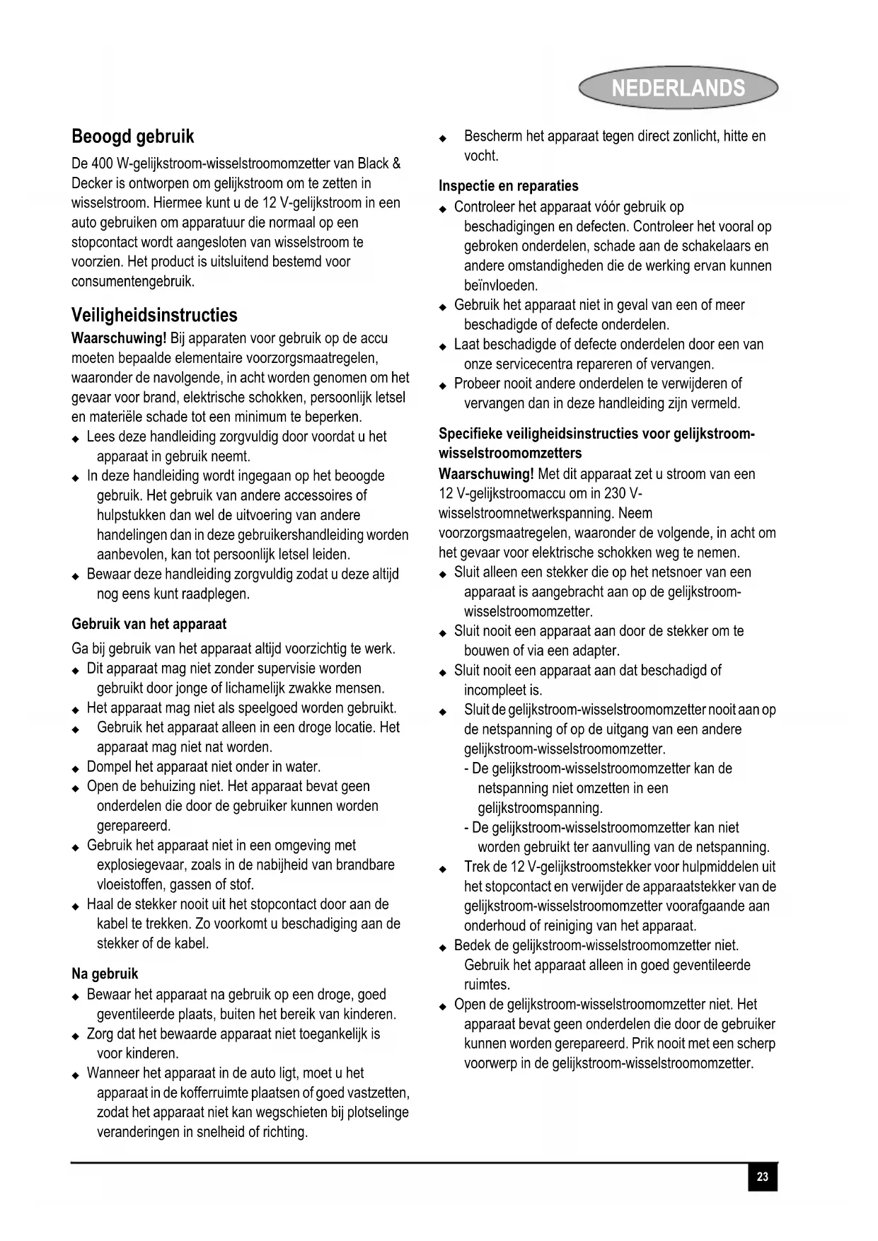 De 400 W-gelijkstroom-wisselstroomomzetter van Black & Decker is ontworpen om gelijkstroom om te zetten in wisselstroom. Hiermee(Int) u de 12 V-gelijkstroom in een auto gebruiken om apparatuur die normal op een stopcontact wordt aangesloten van wisselstroom te voorzien. Het product is uitsluitend bestend voor consumentengebruik.