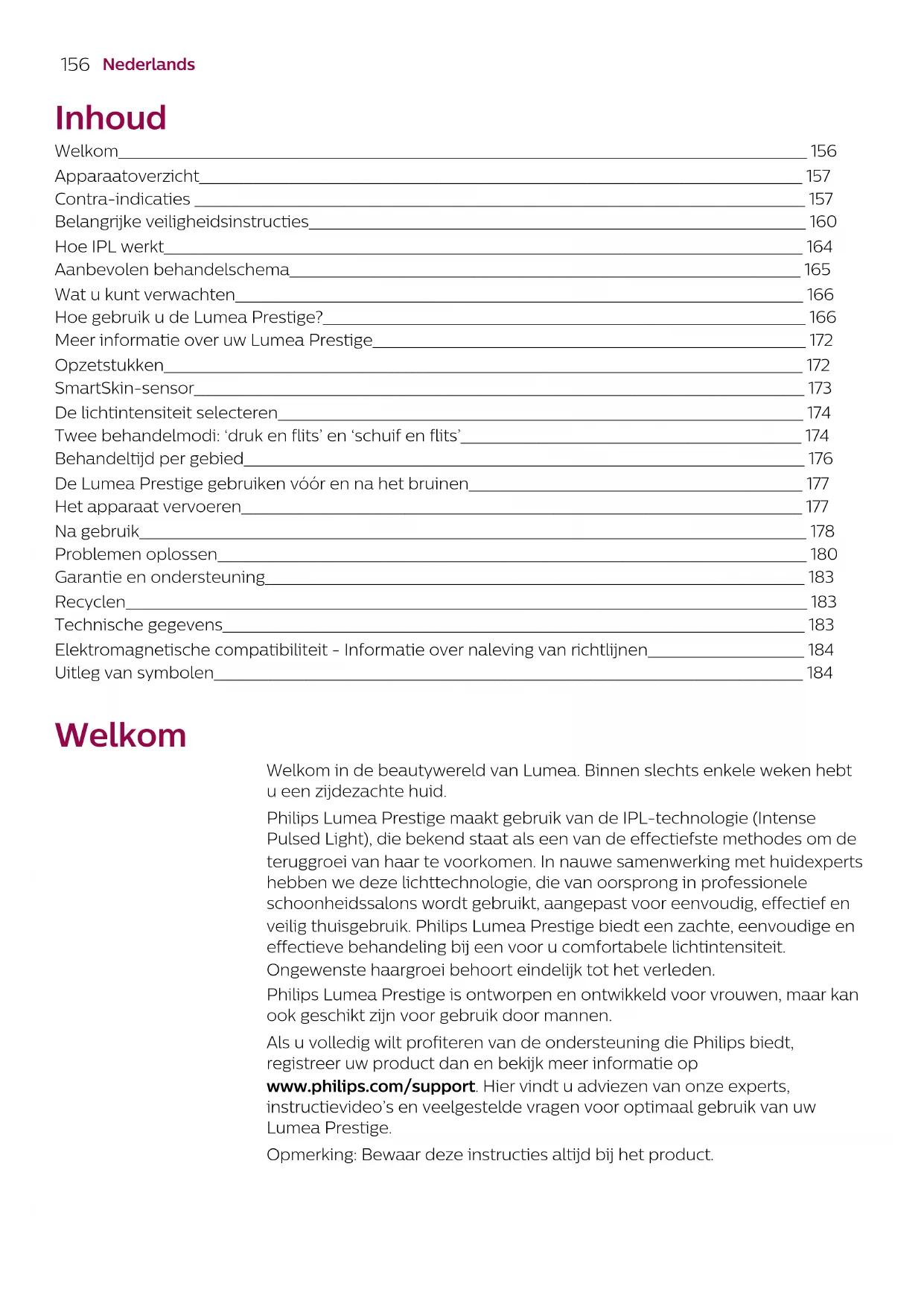 Nederlands Inhoud Welkom_________________________________________________________________________________________________ 156 Apparaatoverzicht_____________________________________________________________________________________ 157 Contra-indicaties ______________________________________________________________________________________ 157 Belangrijke veiligheidsinstructies______________________________________________________________________ 160 Hoe IPL werkt__________________________________________________________________________________________ 164 Aanbevolen behandelschema________________________________________________________________________ 165 Wat u kunt verwachten________________________________________________________________________________ 166 Hoe gebruik u de Lumea Prestige?____________________________________________________________________ 166 Meer informatie over uw Lumea Prestige_____________________________________________________________ 172 Opzetstukken__________________________________________________________________________________________ 172 SmartSkin-sensor______________________________________________________________________________________ 173 De lichtintensiteit selecteren__________________________________________________________________________ 174 Twee behandelmodi: ‘druk en flits’ en ‘schuif en flits’________________________________________________ 174 Behandeltijd per gebied_______________________________________________________________________________ 176 De Lumea Prestige gebruiken vóór en na het bruinen_______________________________________________ 177 Het apparaat vervoeren_______________________________________________________________________________ 177 Na gebruik______________________________________________________________________________________________ 178 Problemen oplossen___________________________________________________________________________________ 180 Garantie en ondersteuning____________________________________________________________________________ 183 Recyclen________________________________________________________________________________________________ 183 Technische gegevens__________________________________________________________________________________ 183 Elektromagnetische compatibiliteit - Informatie over naleving van richtlijnen______________________ 184 Uitleg van symbolen___________________________________________________________________________________ 184 Welkom Welkom in de beautywereld van Lumea. Binnen slechts enkele weken hebt u een zijdezachte huid. Philips Lumea Prestige maakt gebruik van de IPL-technologie (Intense Pulsed Light), die bekend staat als een van de effectiefste methodes om de teruggroei van haar te voorkomen. In nauwe samenwerking met huidexperts hebben we deze lichttechnologie, die van oorsprong in professionele schoonheidssalons wordt gebruikt, aangepast voor eenvoudig, effectief en veilig thuisgebruik. Philips Lumea Prestige biedt een zachte, eenvoudige en effectieve behandeling bij een voor u comfortabele lichtintensiteit. Ongewenste haargroei behoort eindelijk tot het verleden. Philips Lumea Prestige is ontworpen en ontwikkeld voor vrouwen, maar kan ook geschikt zijn voor gebruik door mannen. Als u volledig wilt profiteren van de ondersteuning die Philips biedt, registreer uw product dan en bekijk meer informatie op www.philips.com/support. Hier vindt u adviezen van onze experts, instructievideo’s en veelgestelde vragen voor optimaal gebruik van uw Lumea Prestige. Opmerking: Bewaar deze instructies altijd bij het product.157 Nederlands