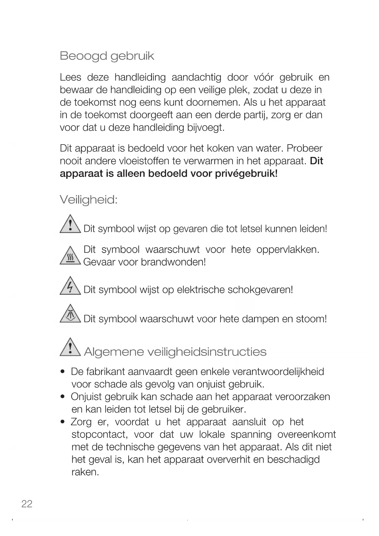 - for damages caused by owner This guarantee does not affect your statutory right, nor any legal right you may have as a costumer under applicable national legislation governing the purchase of goods. In order to assert his/her right in a guarantee case during the guaranteed period, the customer must provide evidence of the date of purchase (receipt). The guarantee is to be asserted against KORONA electric GmbH, Sundern/Germany. Service Address: KORONA Service, Am Steinbach 9, 59872 Meschede, Germany Telephone Hotline: 02933 90284-80 Mail: service@korona-electric.de web: www.korona-electric.de within 2 years after the date of purchase. In case of guarantee the customer is given the right to get the appliance repaired at our own or at an authorized shop. Further rights (due to guarantee case) are not given to the customer.22 Beoogd gebruik Lees deze handleiding aandachtig door vóór gebruik en bewaar de handleiding op een veilige plek, zodat u deze in de toekomst nog eens kunt doornemen. Als u het apparaat in de toekomst doorgeeft aan een derde partij, zorg er dan voor dat u deze handleiding bijvoegt. Dit apparaat is bedoeld voor het koken van water. Probeer nooit andere vloeistoffen te verwarmen in het apparaat. Dit apparaat is alleen bedoeld voor privégebruik! Veiligheid: Dit symbool wijst op gevaren die tot letsel kunnen leiden! Dit symbool waarschuwt voor hete oppervlakken. Gevaar voor brandwonden! Dit symbool wijst op elektrische schokgevaren! Dit symbool waarschuwt voor hete dampen en stoom! Algemene veiligheidsinstructies